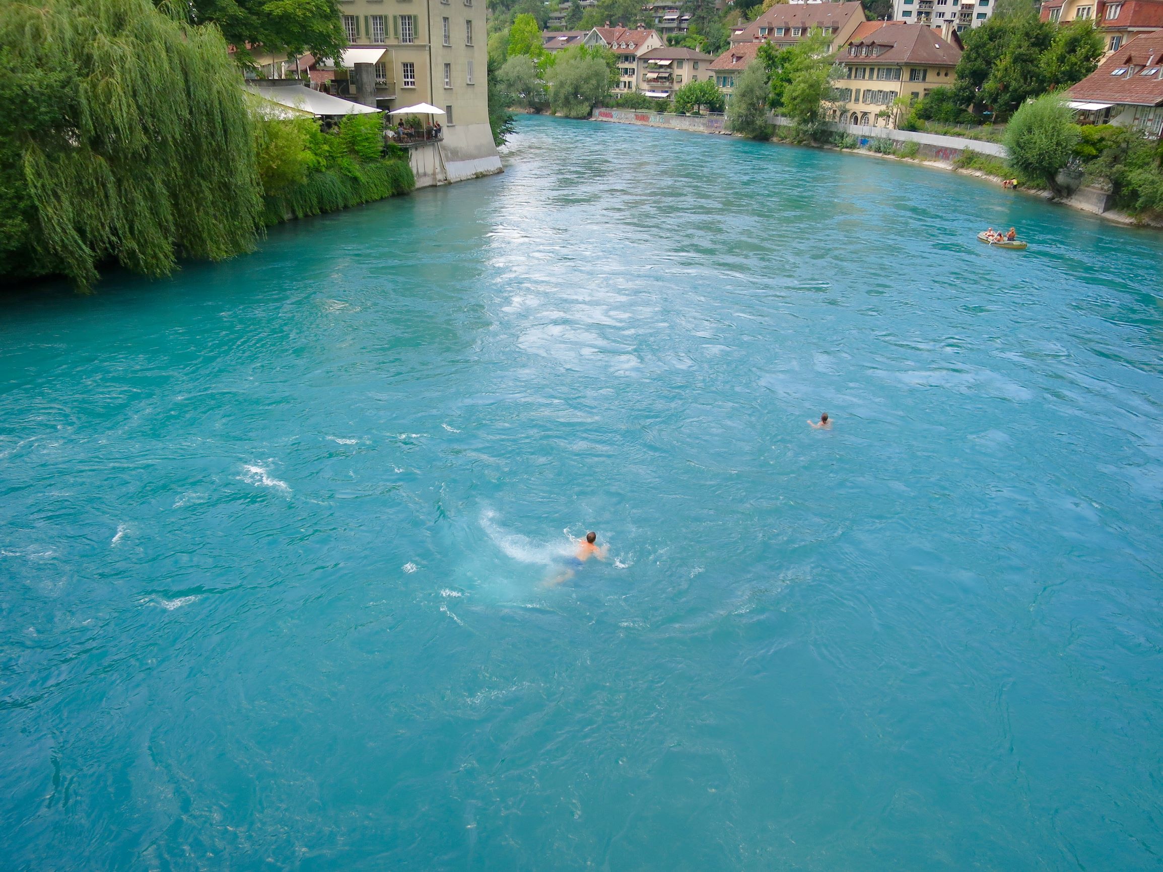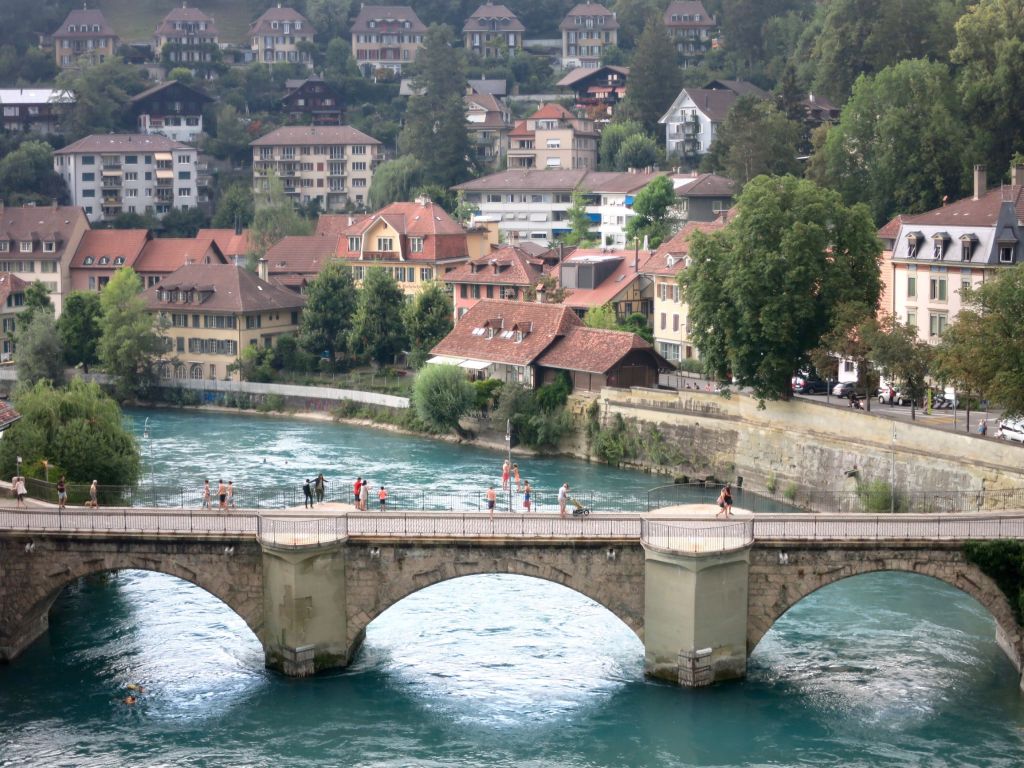 De plus, on a découvert que les Bernois ont une relation très spéciale avec leur rivière et qu’ils se jettent littéralement dans ses eaux, de n’importe quel point de sa rive. Lors de notre visite, on a vu partout en ville des gens se promener en maillot de bain et se jeter dans la rivière depuis le parc et même depuis les ponts. Une fois dans l’eau, le courant, ma foi assez fort, les mène on ne sait où.