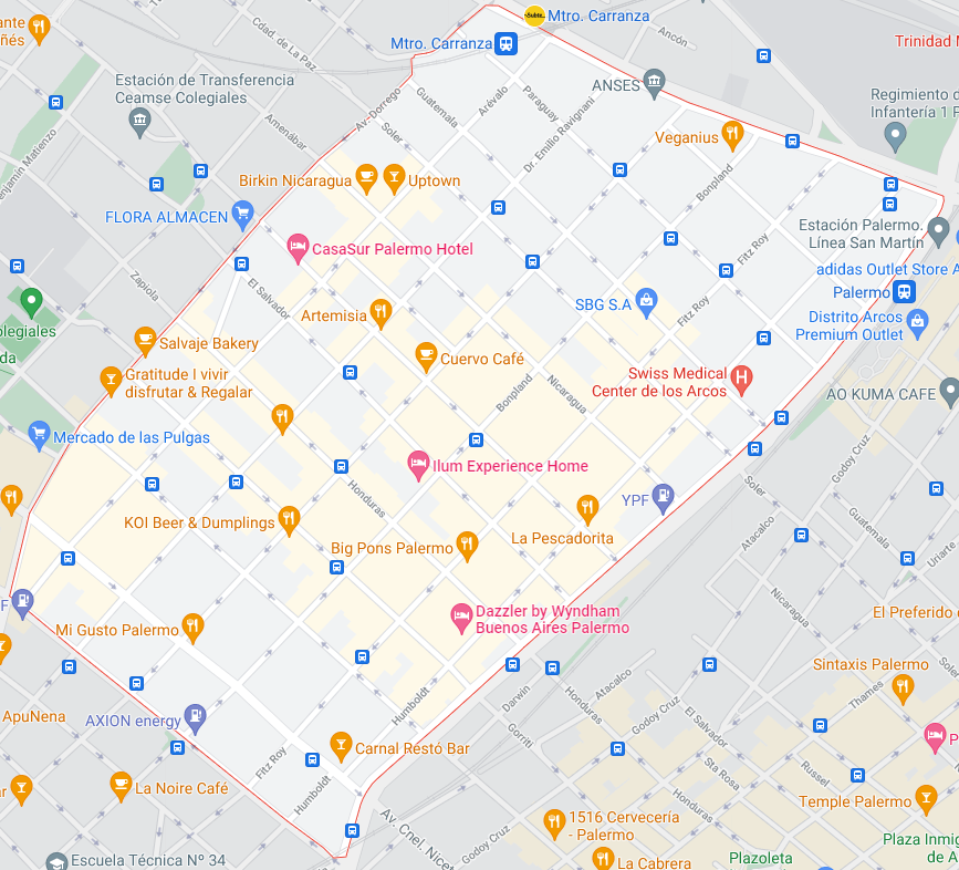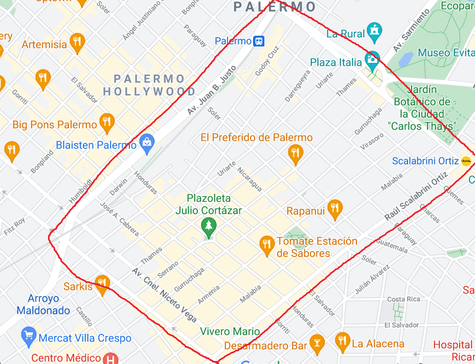 Il est délimité par les avenues Santa Fé et Cordoba, d’est en ouest, et par les avenues Juan B. Justo et Scalabrini Ortiz, du nord au sud.