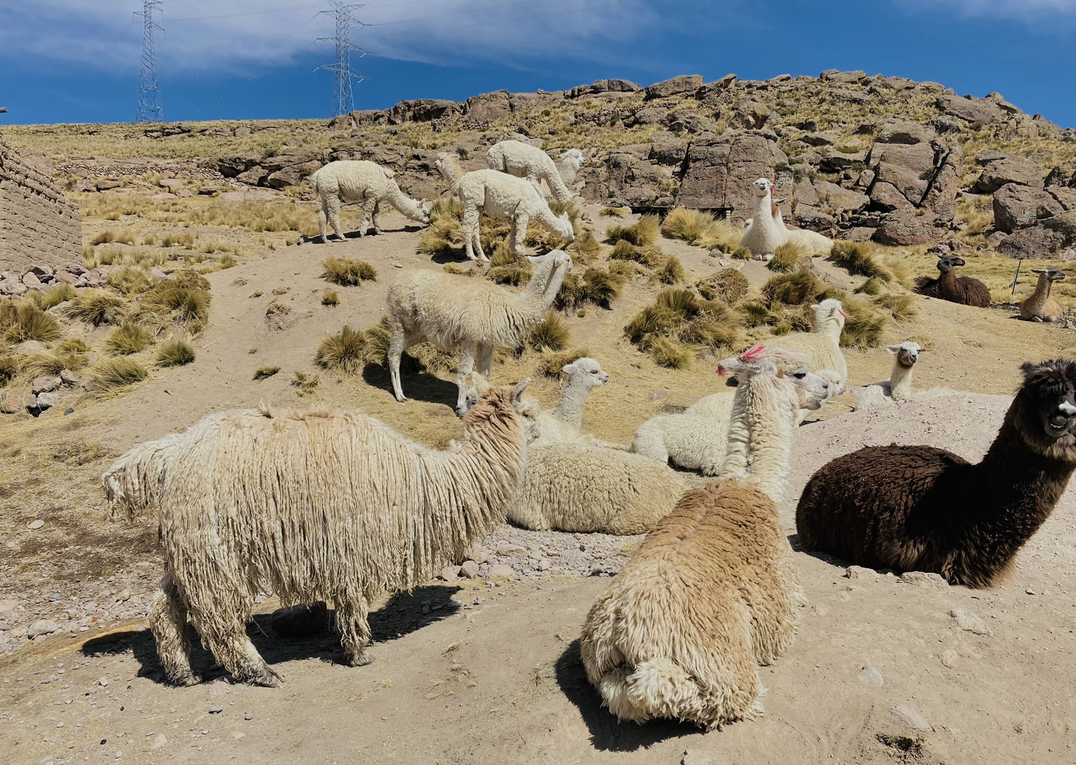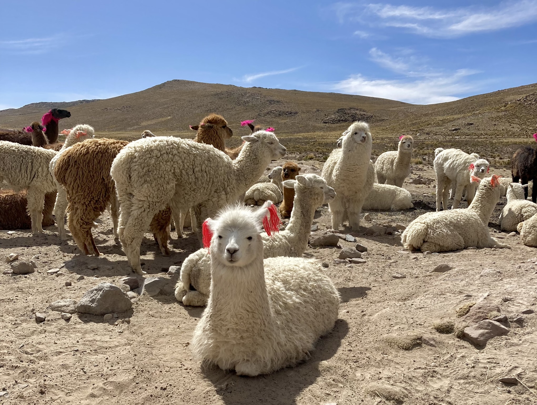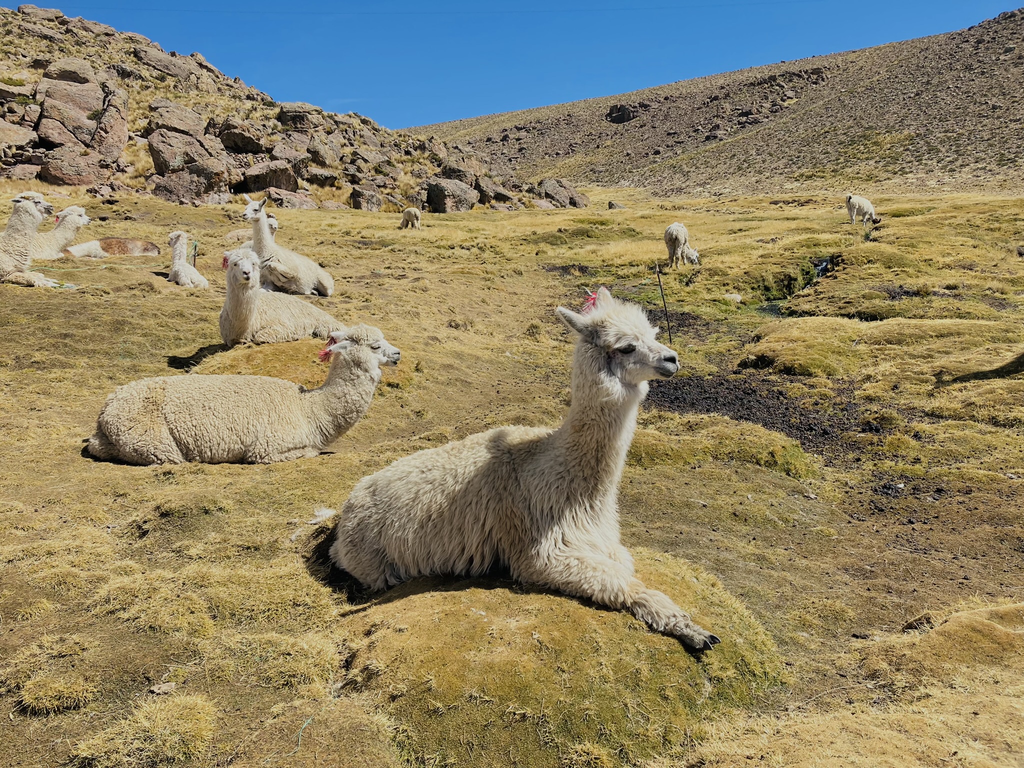 Voici un deuxième troupeau que nous avons pris le temps d’observer. L’alpaga qui a le poil long est appelée Alpaga rasta. C’est une alpaca suri, son poil peut aller jusqu’aux pieds.