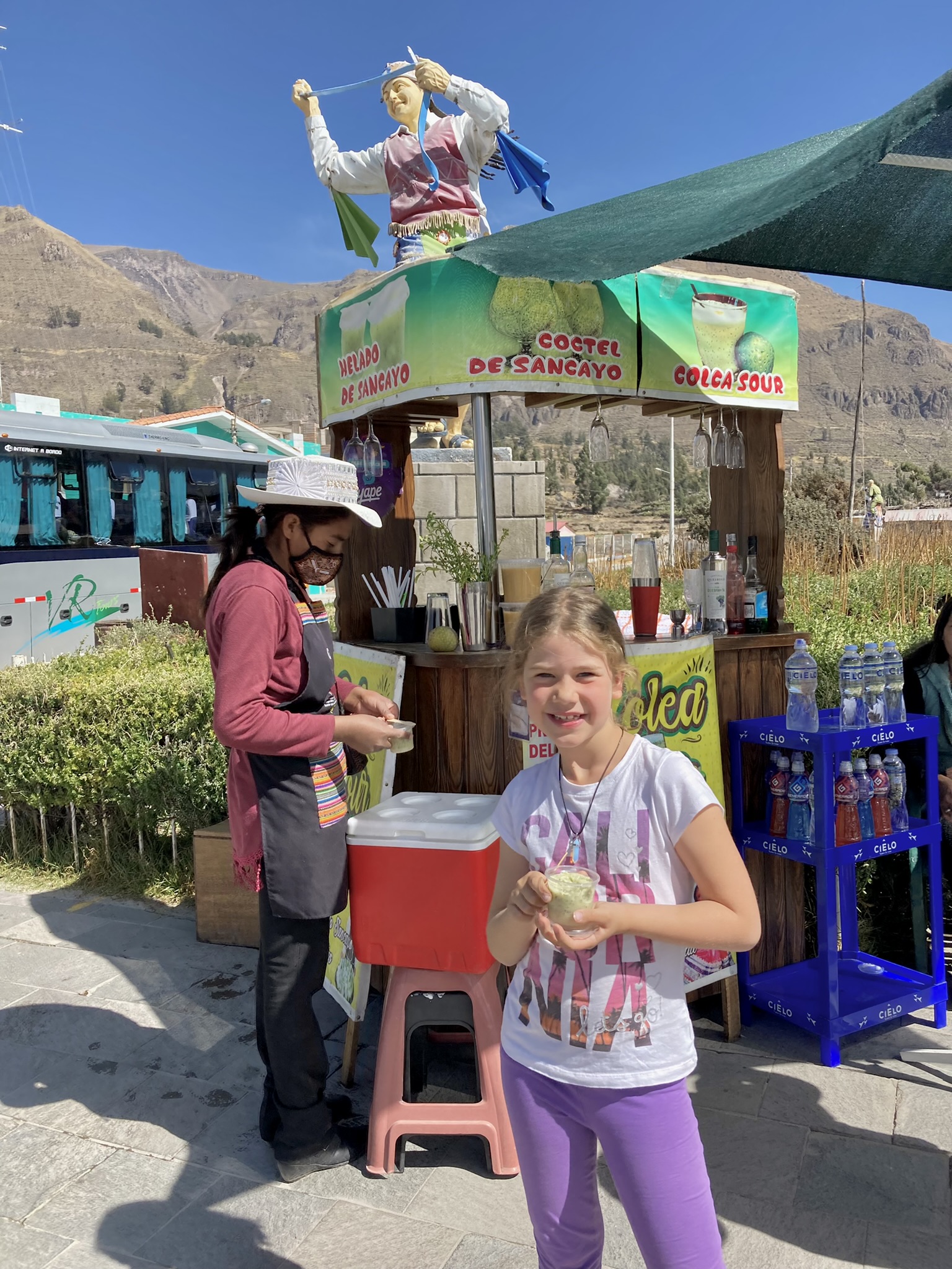 Du coup, nous avons voulu essayer la glace de sancoyo, vraiment trop bonne. Et Dominic, qui ne rate pas une, a pris un Colca sour, un cocktail à base de jus de sancoyo et de pisco. Pas mal du tout!!!