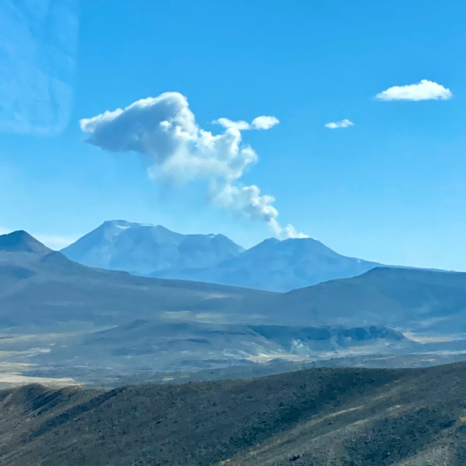 Nous avons atteint le mirador de los Volcanes à 4910 m d’altitude. Des nombreux volcans sont visibles depuis le mirador et depuis la route : Misti, Chachani, Ampato, tous en activité et atteignant entre 5800 à 6200 m d’altitude.