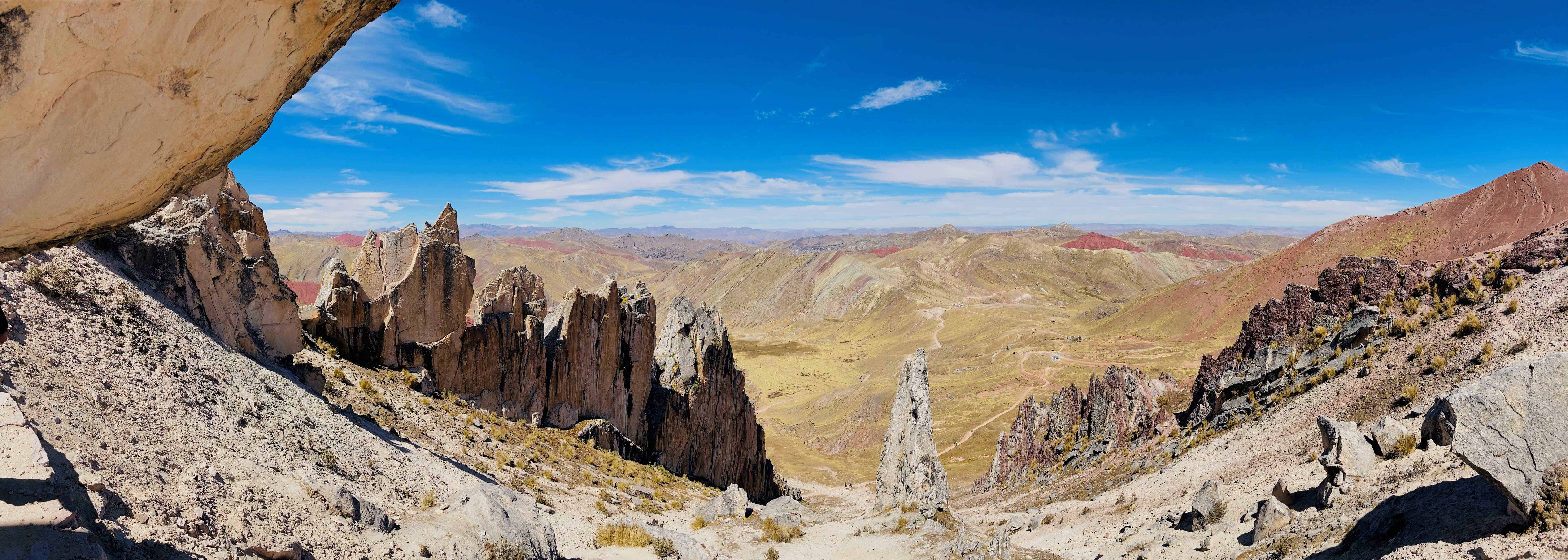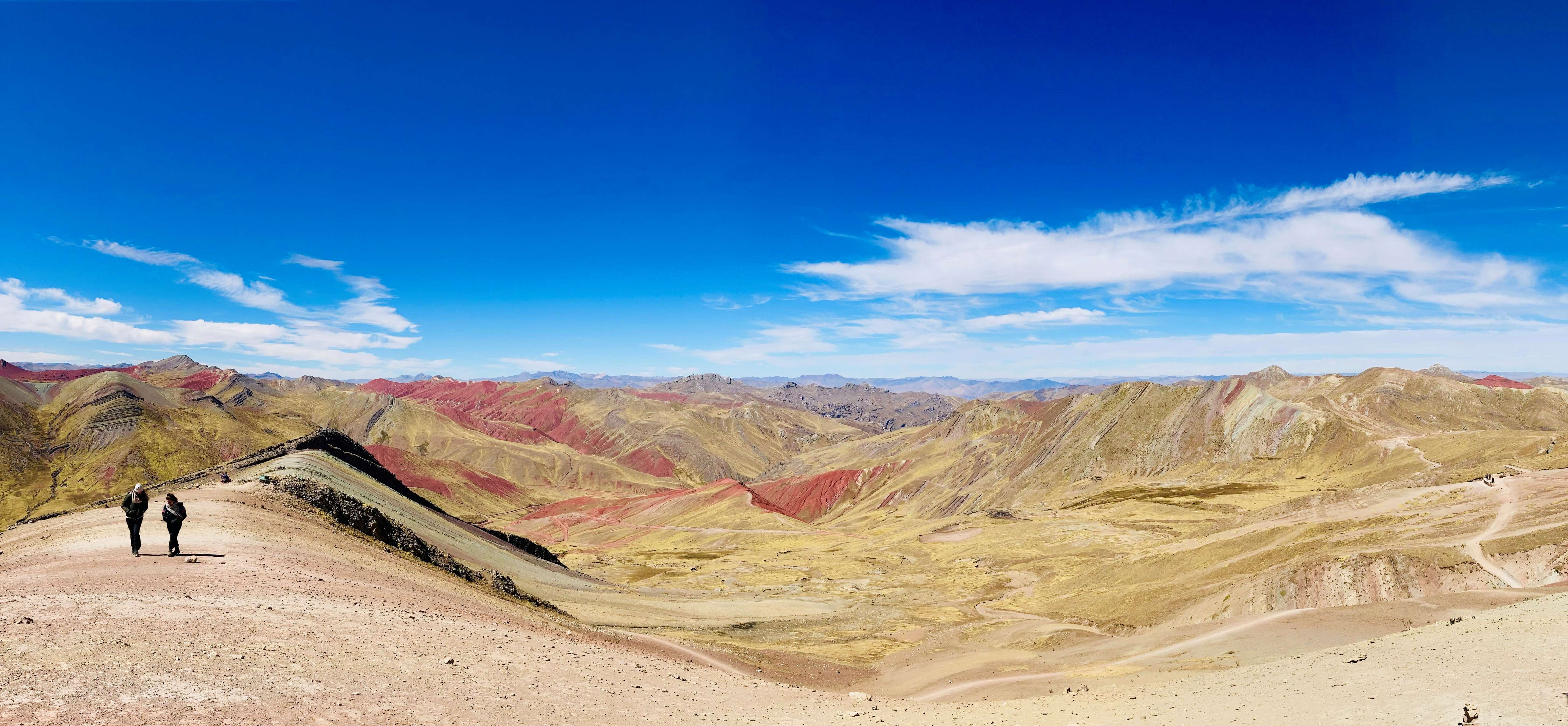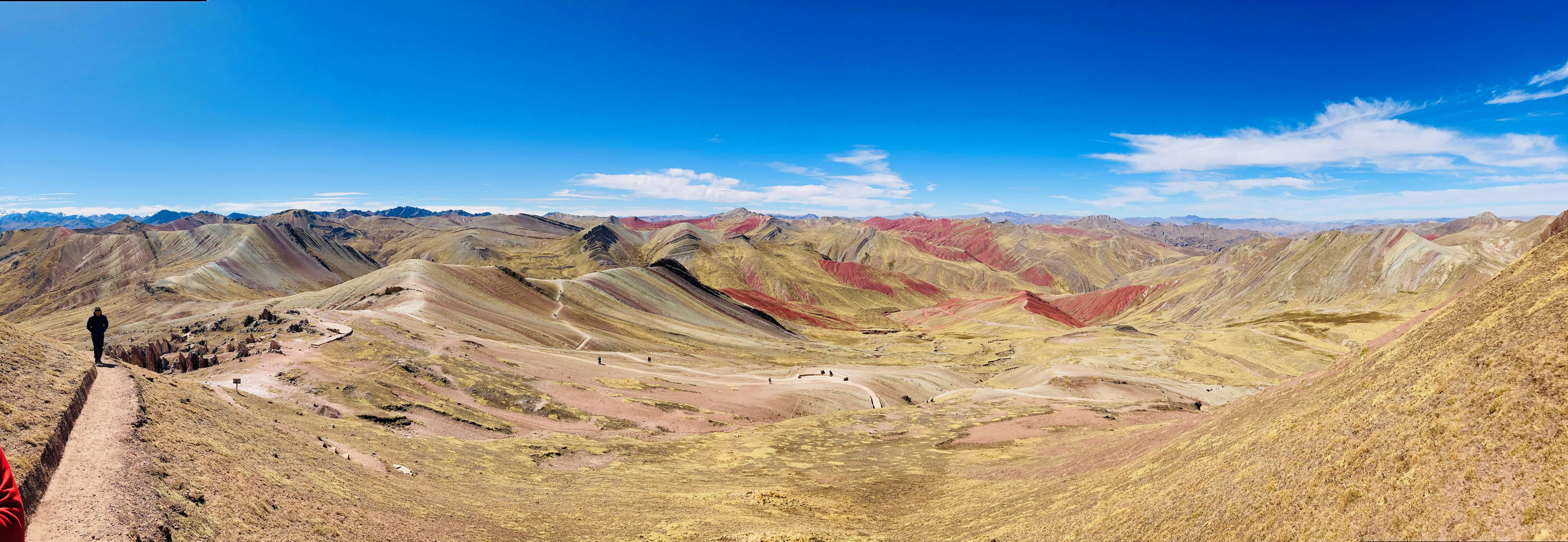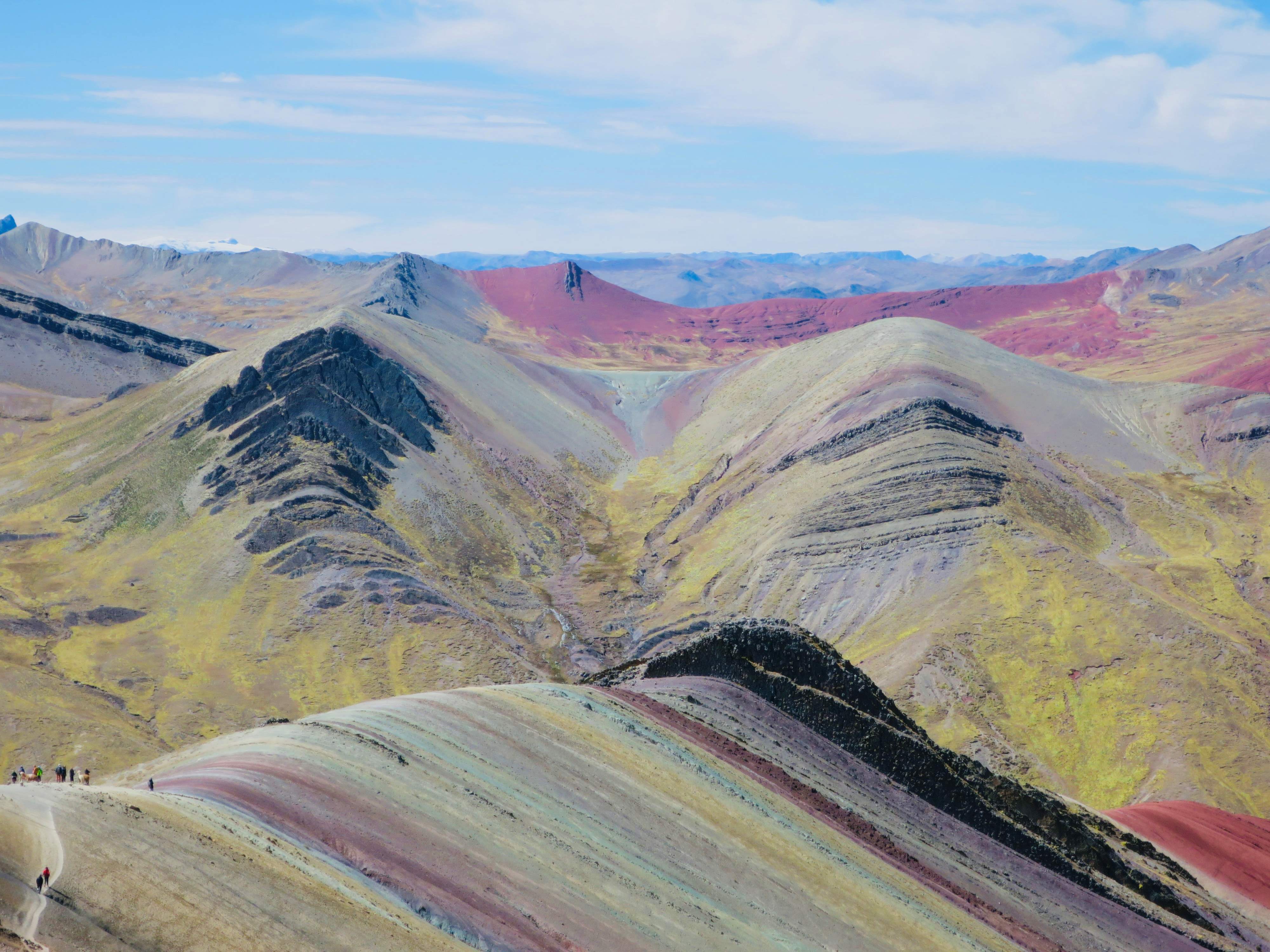 Contrairement à Vinicunca, la montagne arc-en-ciel la plus visitée, on a ici toute la cordillère colorée à perte de vue. C’est un spectacle incroyable. Cette partie de la cordillère était autrefois couverte de glace. C’est l’oxydation des minéraux lors du dégel qui a donné ses merveilleuses couleurs aux montagnes.