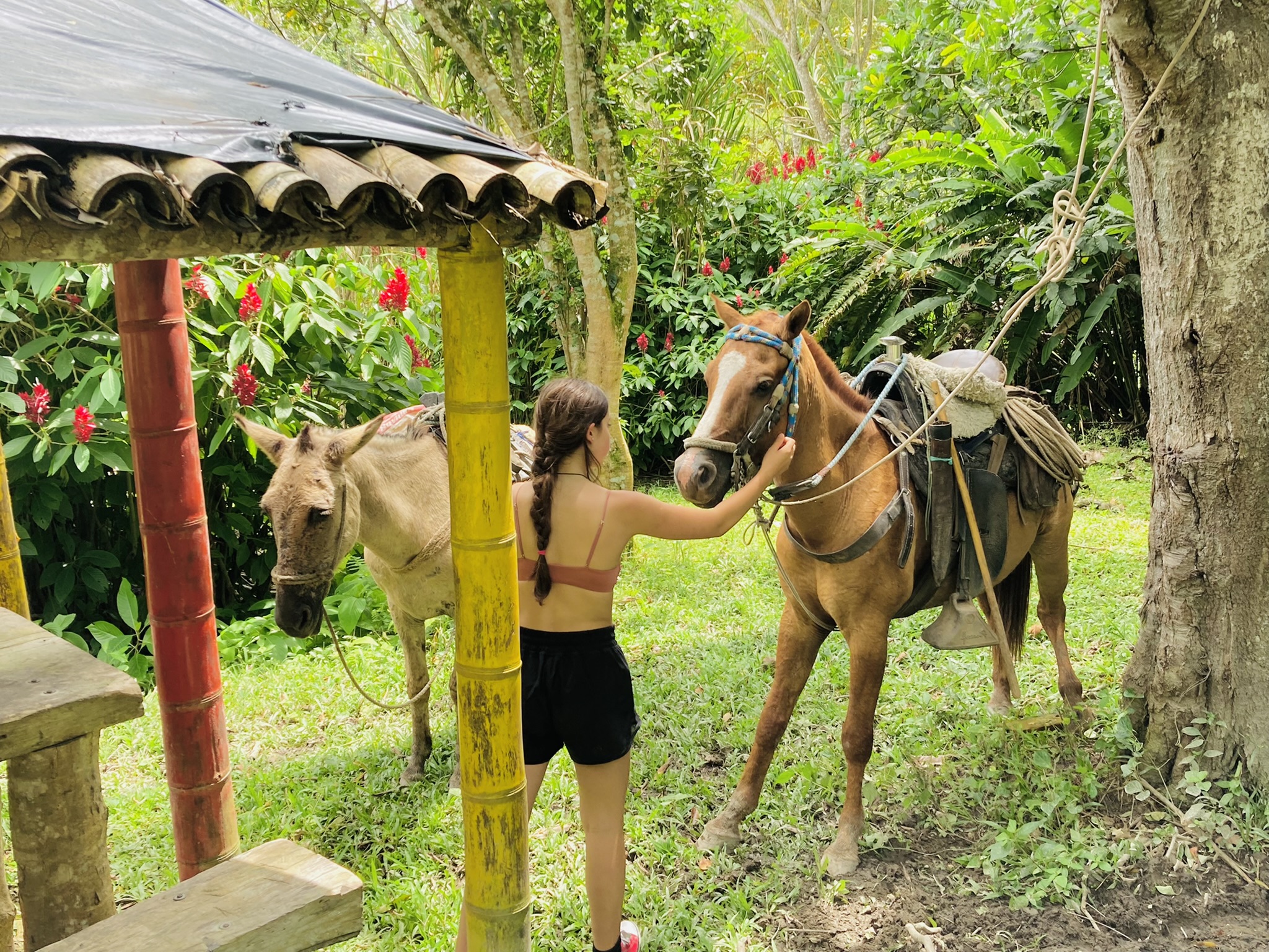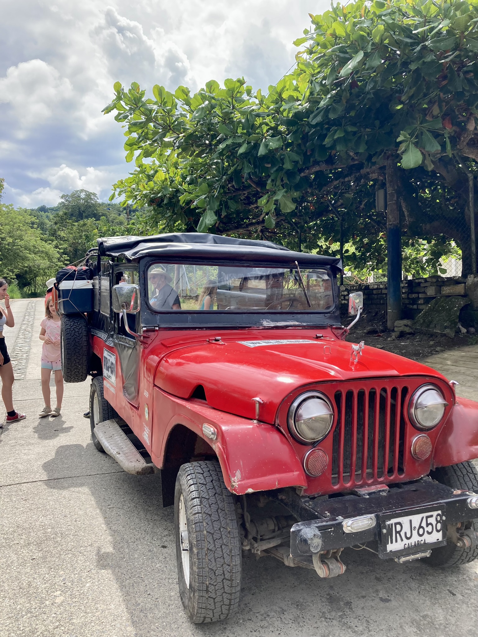 L’aventure a commencé lorsqu’une jeep Willy de 1955 nous a embarqué tous les 9 pour nous mener à Puerto Alejandría. Moyen de transport traditionnel de la région qui peut embarquer jusqu’à 25 personnes! On voyage en arrière, debout si le cœur nous en dit. Et les enfants (et mon amoureux surtout) ont trippé (malgré l’état douteux de certaines portions de la route hahaha!)