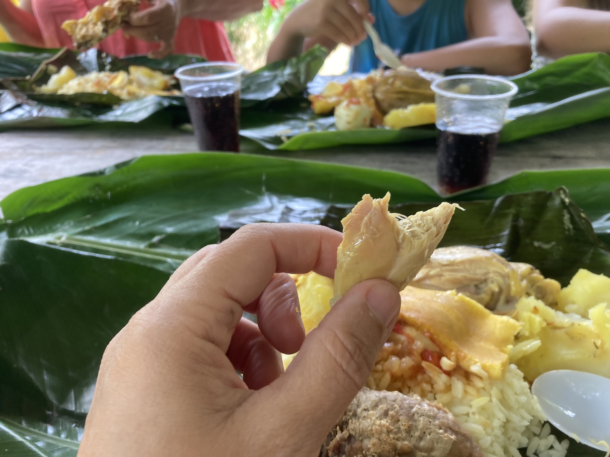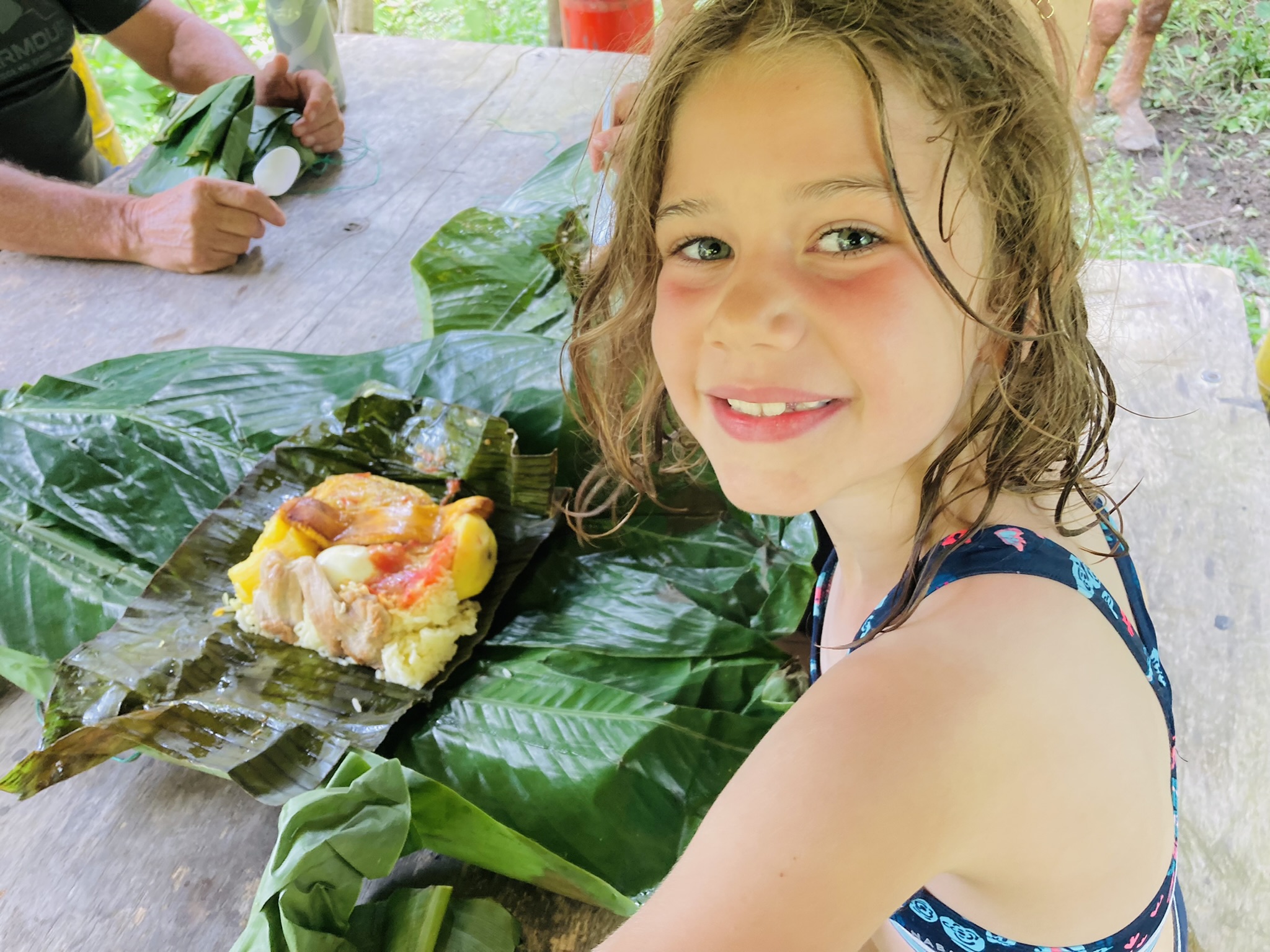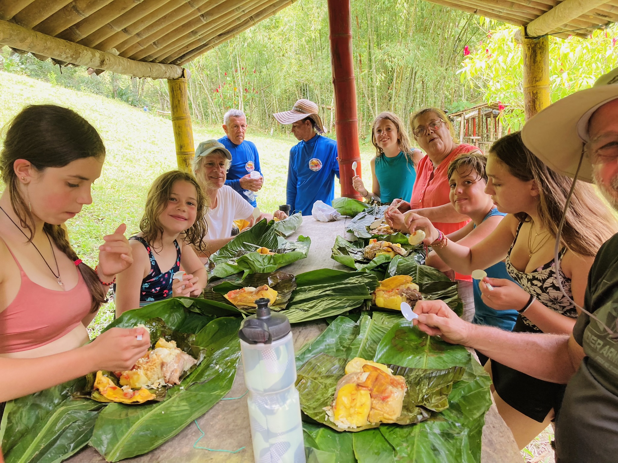 A mi-parcours, on a arrêté dans un « punto seco » (point sec littéralement) qu’ils appellent, où ils nous ont servi un « fiambre », plat traditionnel des « campesinos »(fermiers) du Quindío : du riz, du poulet, des pommes de terre, de la yuca, de la banane plantain, du bœuf et un œuf avec une petite sauce tomate, le tout enveloppé dans une feuille de bananier. C’était vraiment très bon et très copieux.