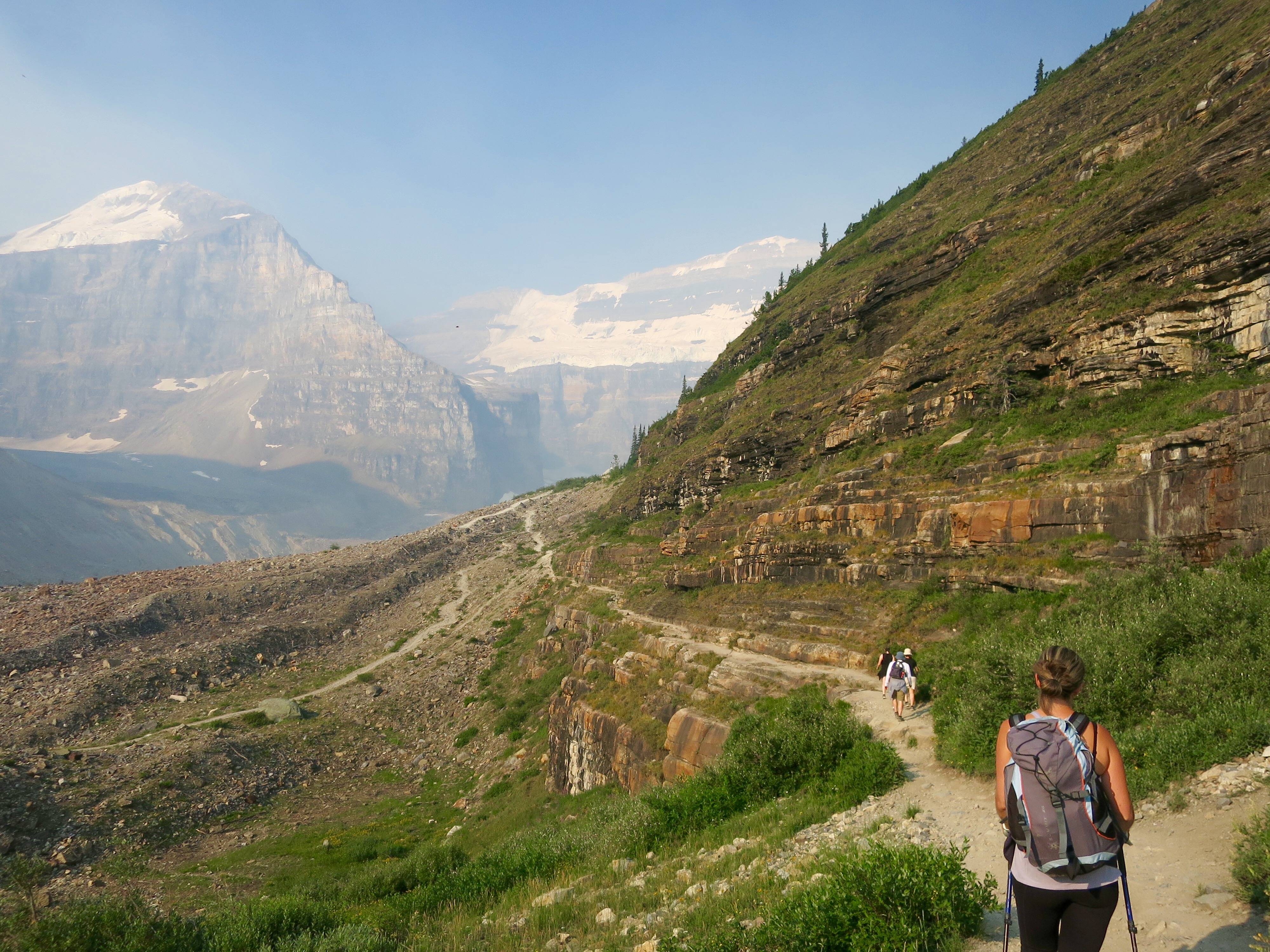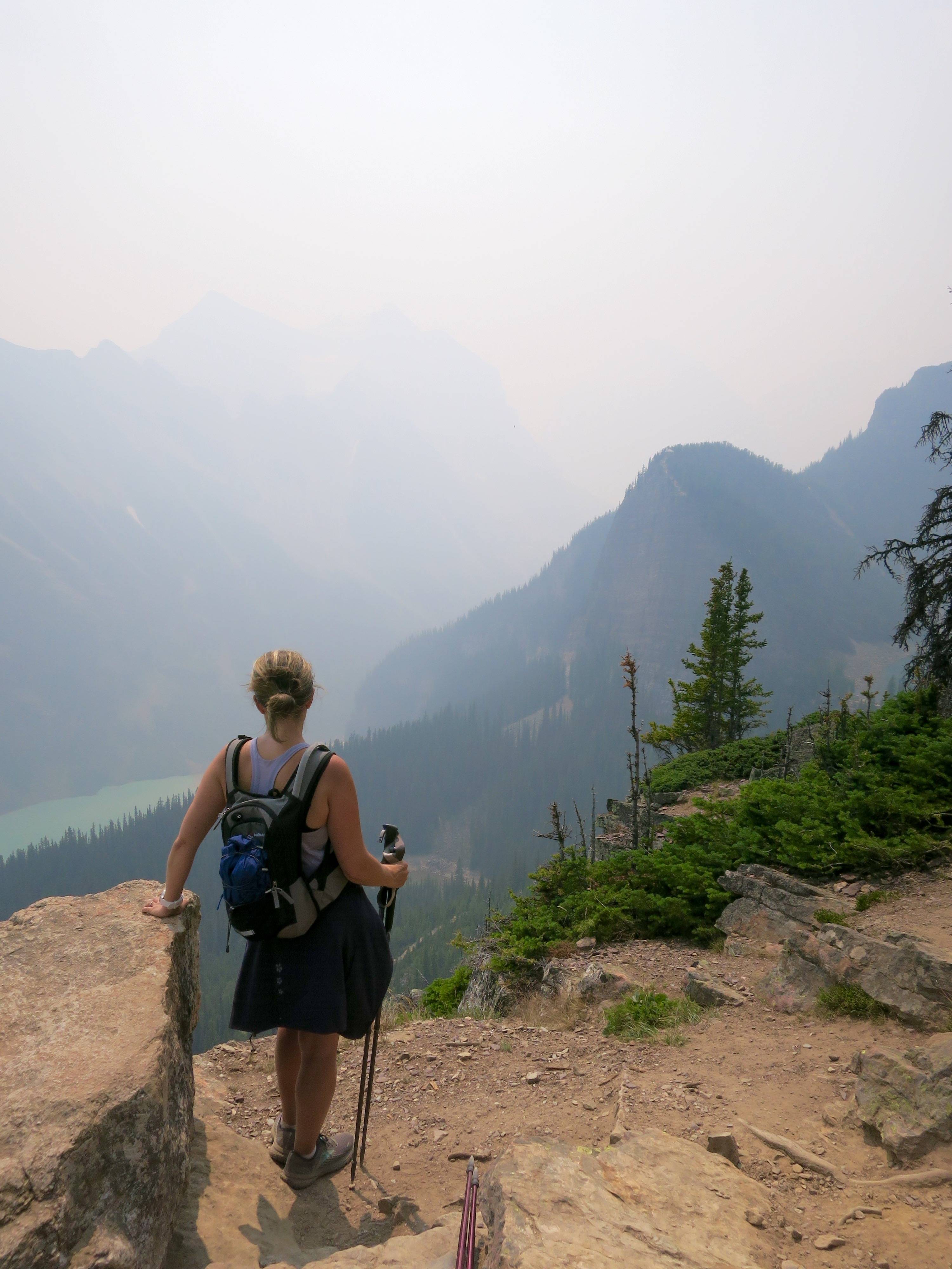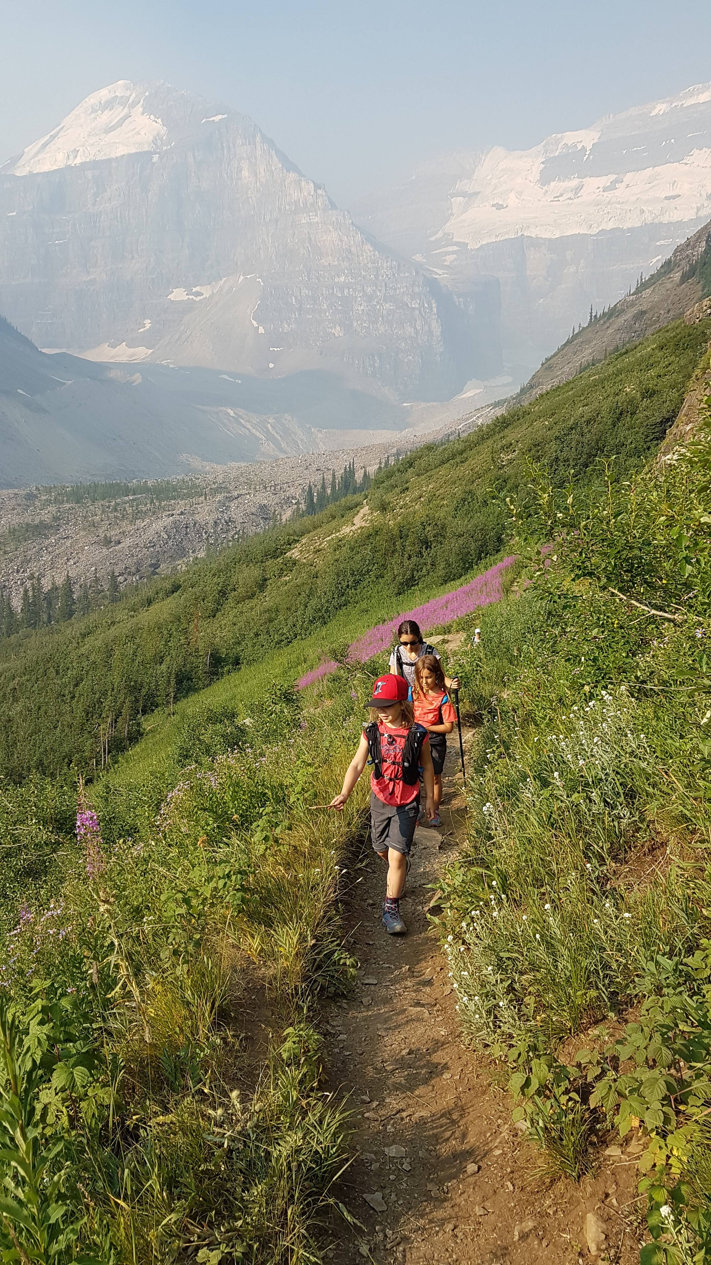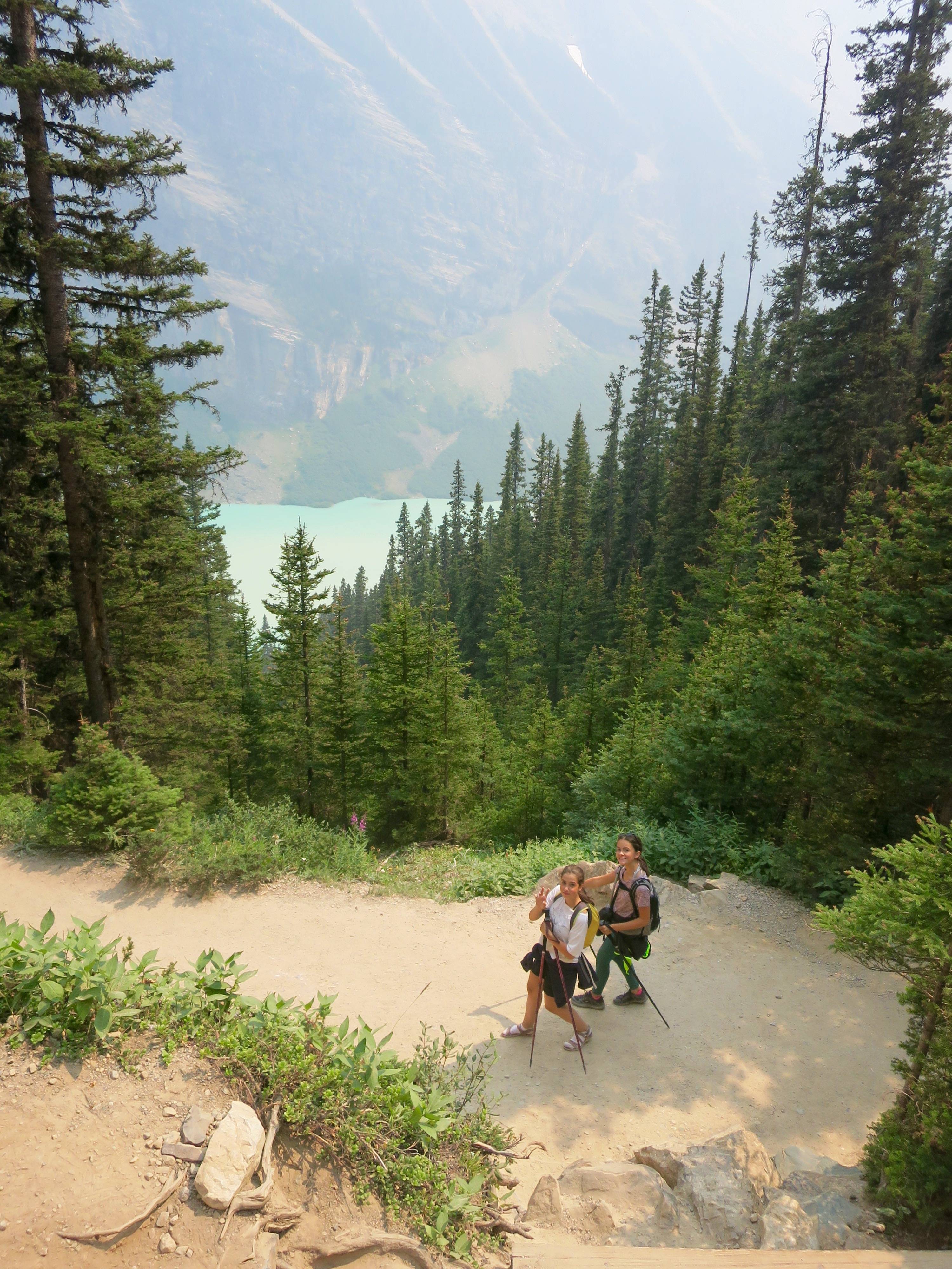 Après une pause et une tentative de baignade dans les eaux glaciales du Lac Agnès (elles sont à 5°C), les adultes ont décidé de grimper jusqu’au Big Beehive. Une montée assez raide d’environ 45 min récompensée par une spectaculaire vue sur le Lac Louise.