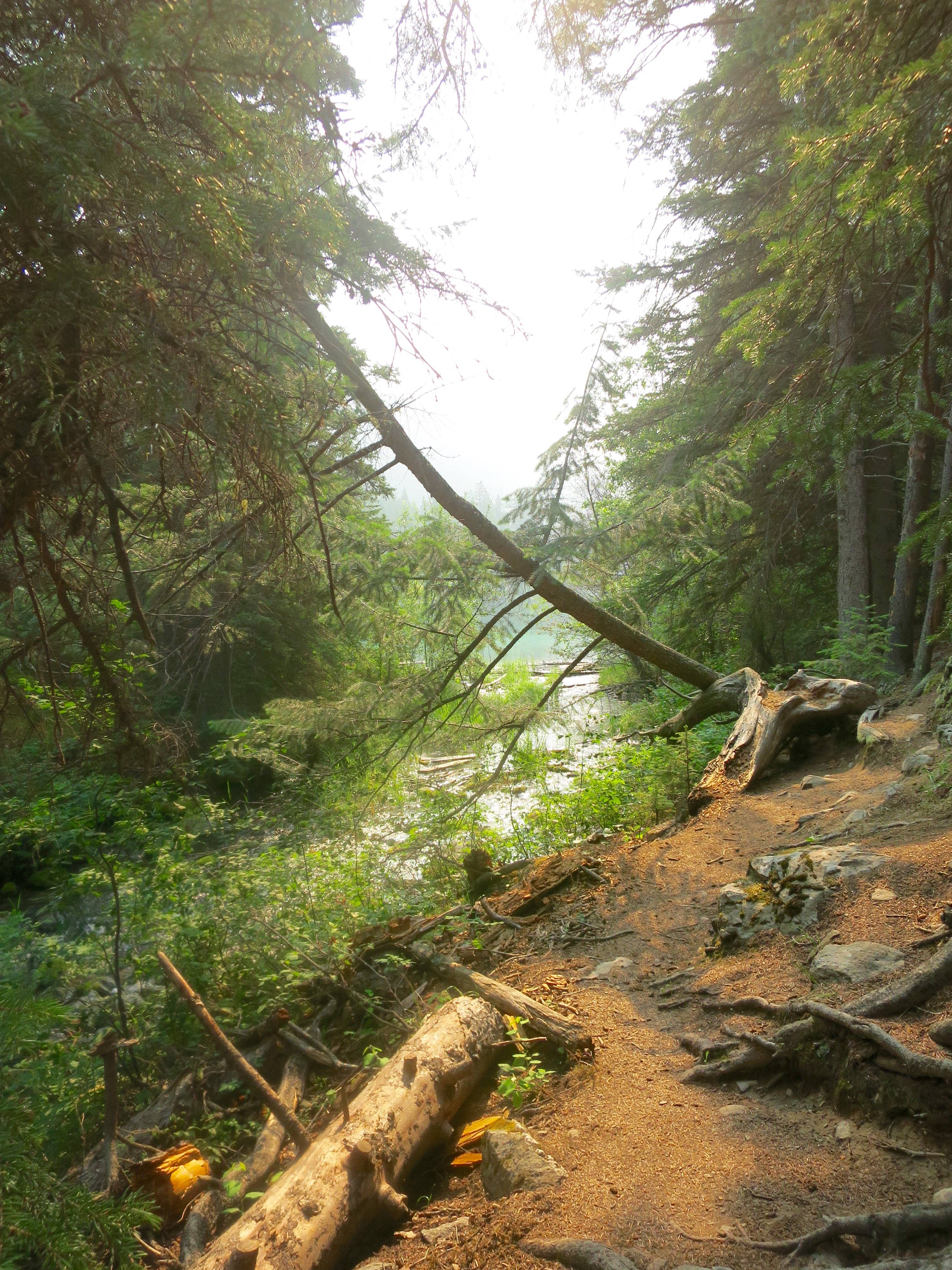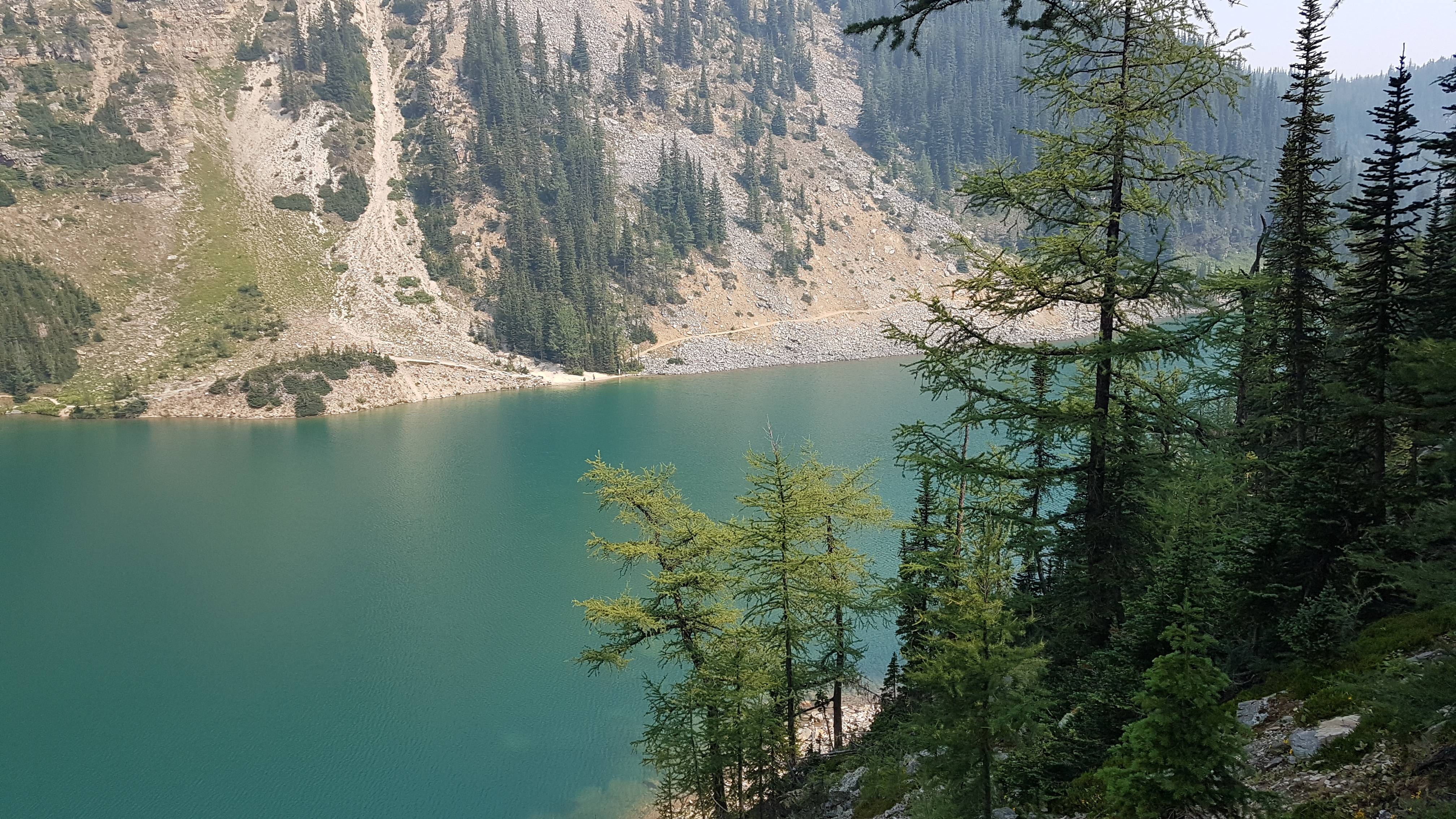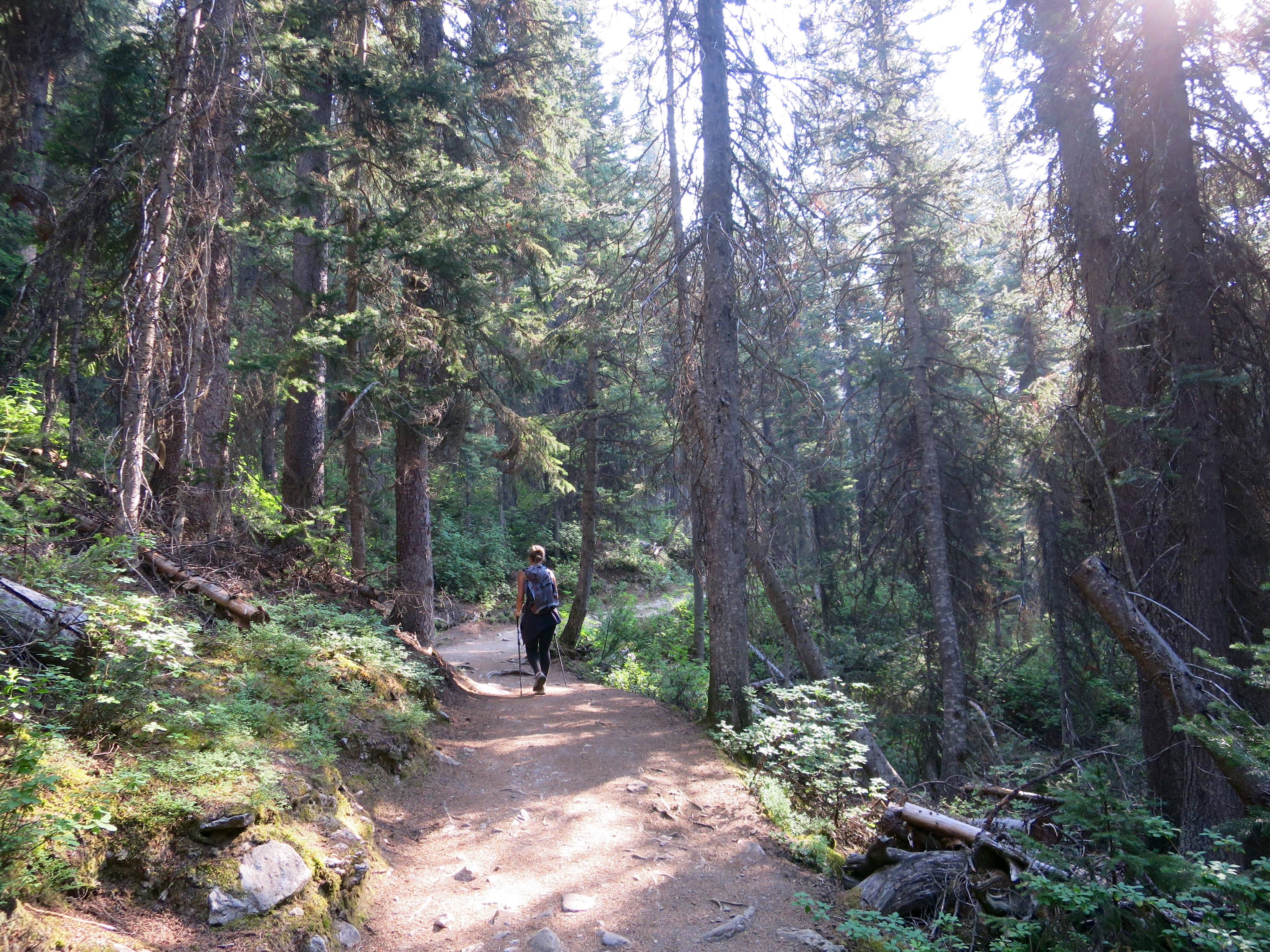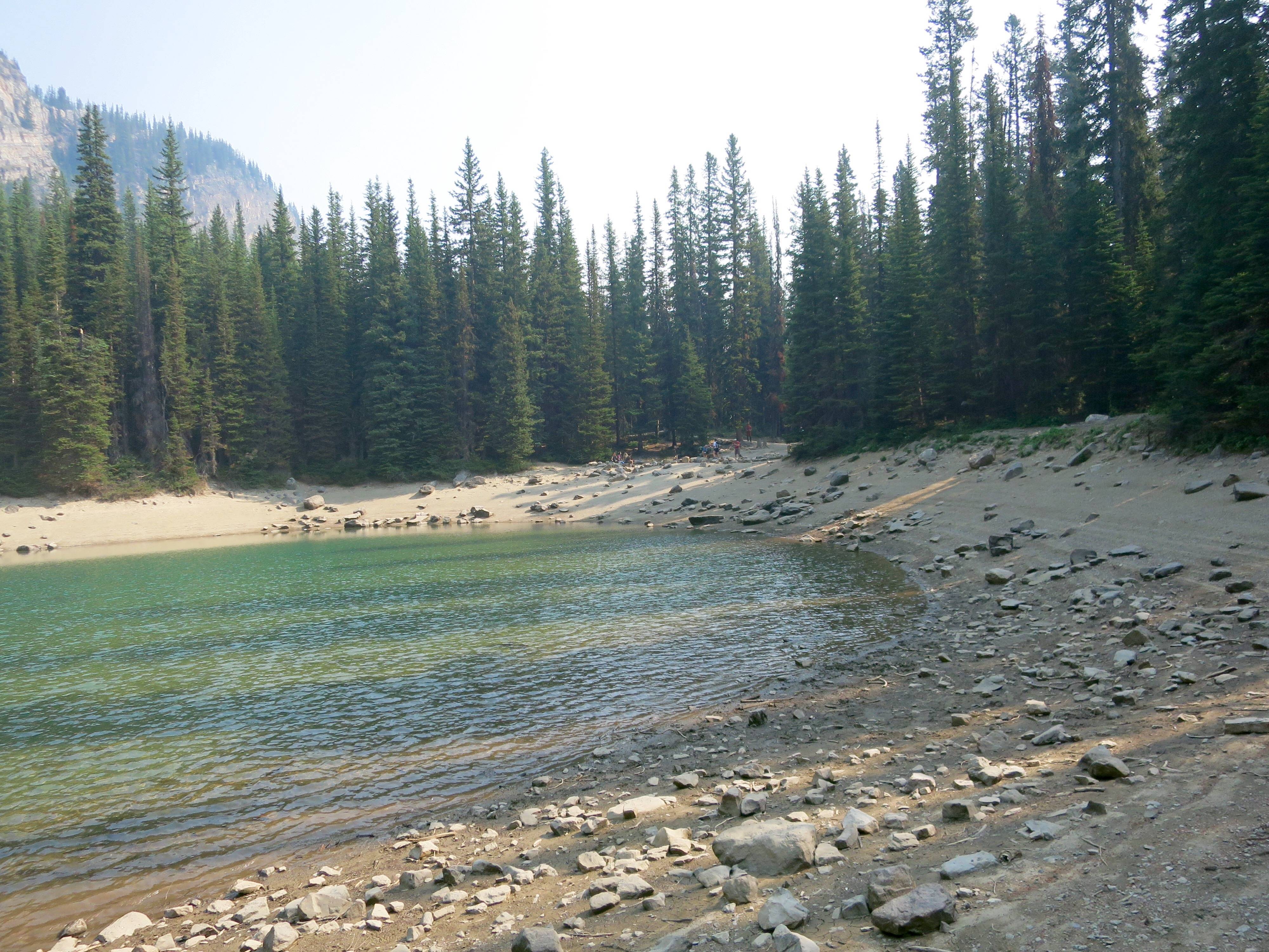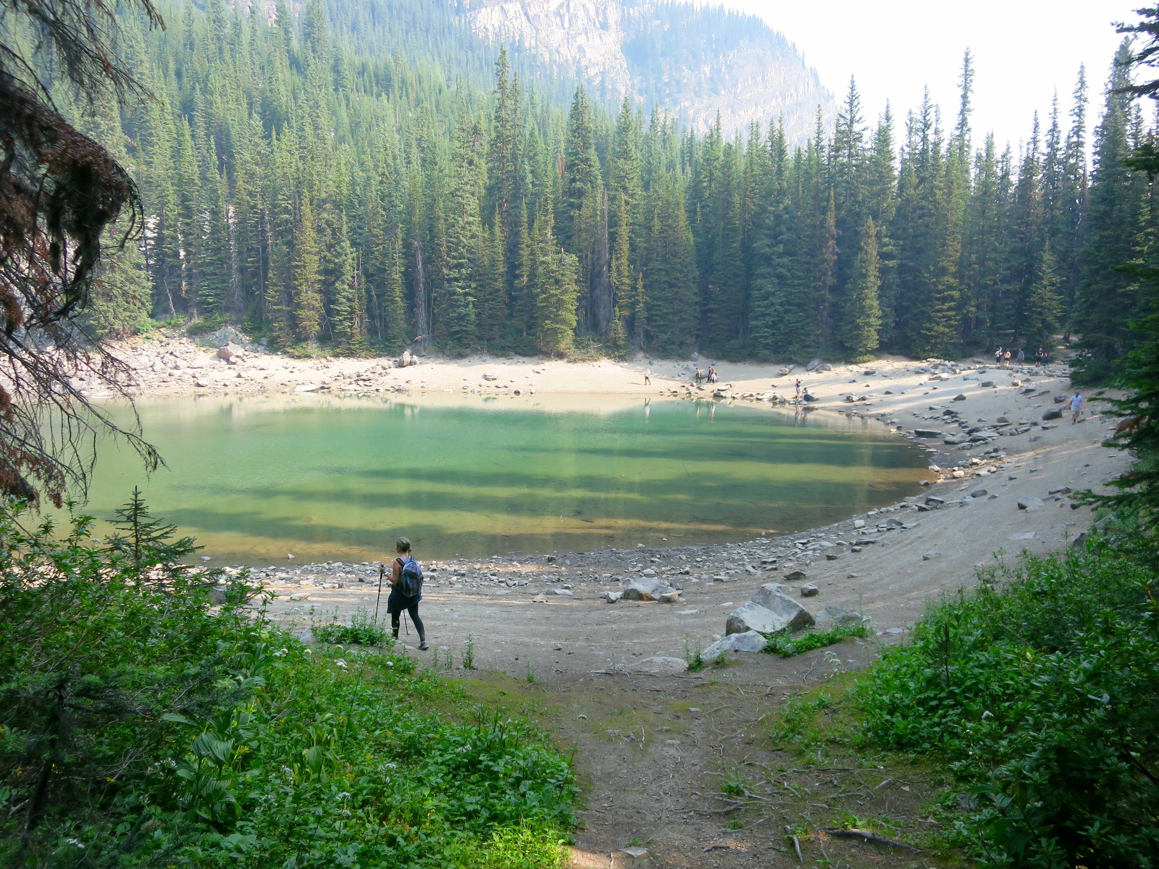 Du sentier de la Plaine-des-Six-Glaciers, on a bifurqué vers le sentier du Lac Agnès. On a marché principalement en forêt, on a atteint tout d’abord le Lac Mirror, où nous avons fait une pause pour admirer sa couleur irréelle.