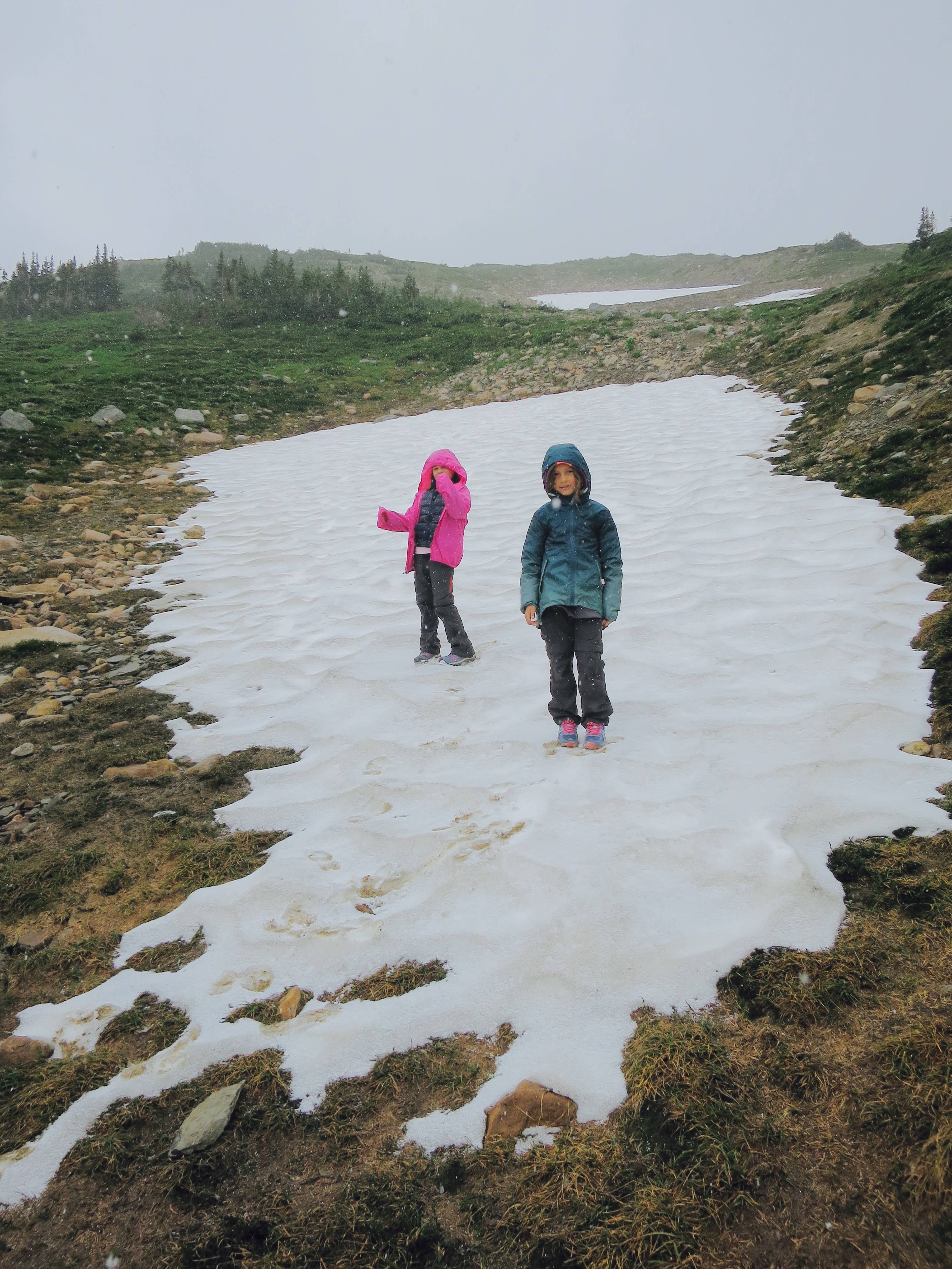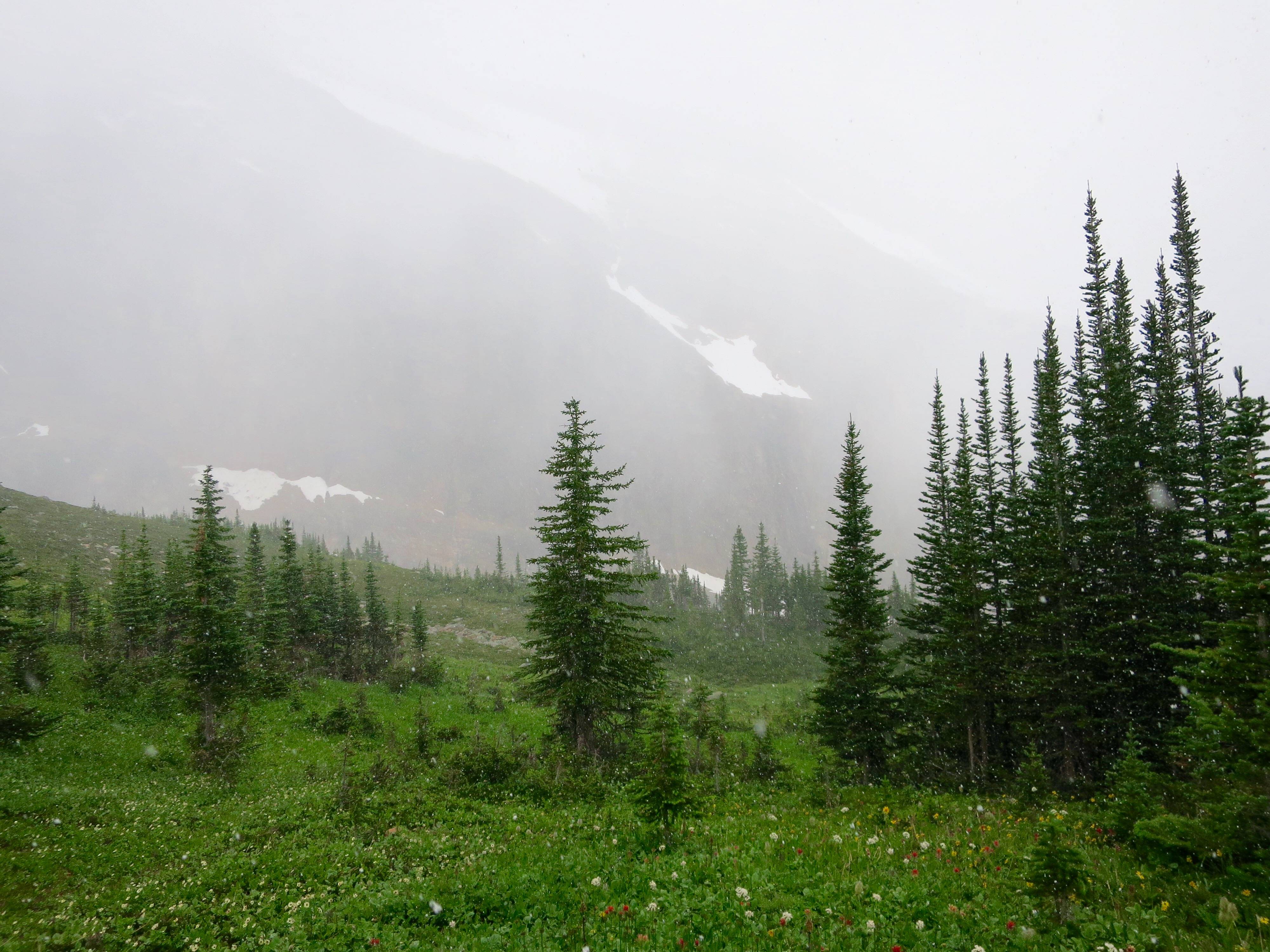 Nous avons entrepris ensuite le sentier Cavell Meadows : une randonnée de 4h30, de 9 km environ. Nous sommes montés jusqu’à 2254 m d’altitude. En chemin, nous avons tout eu : de la pluie au début, de la neige à mi-hauteur, un vent très fort et un froid glacial au sommet. Mais nous avons adoré!