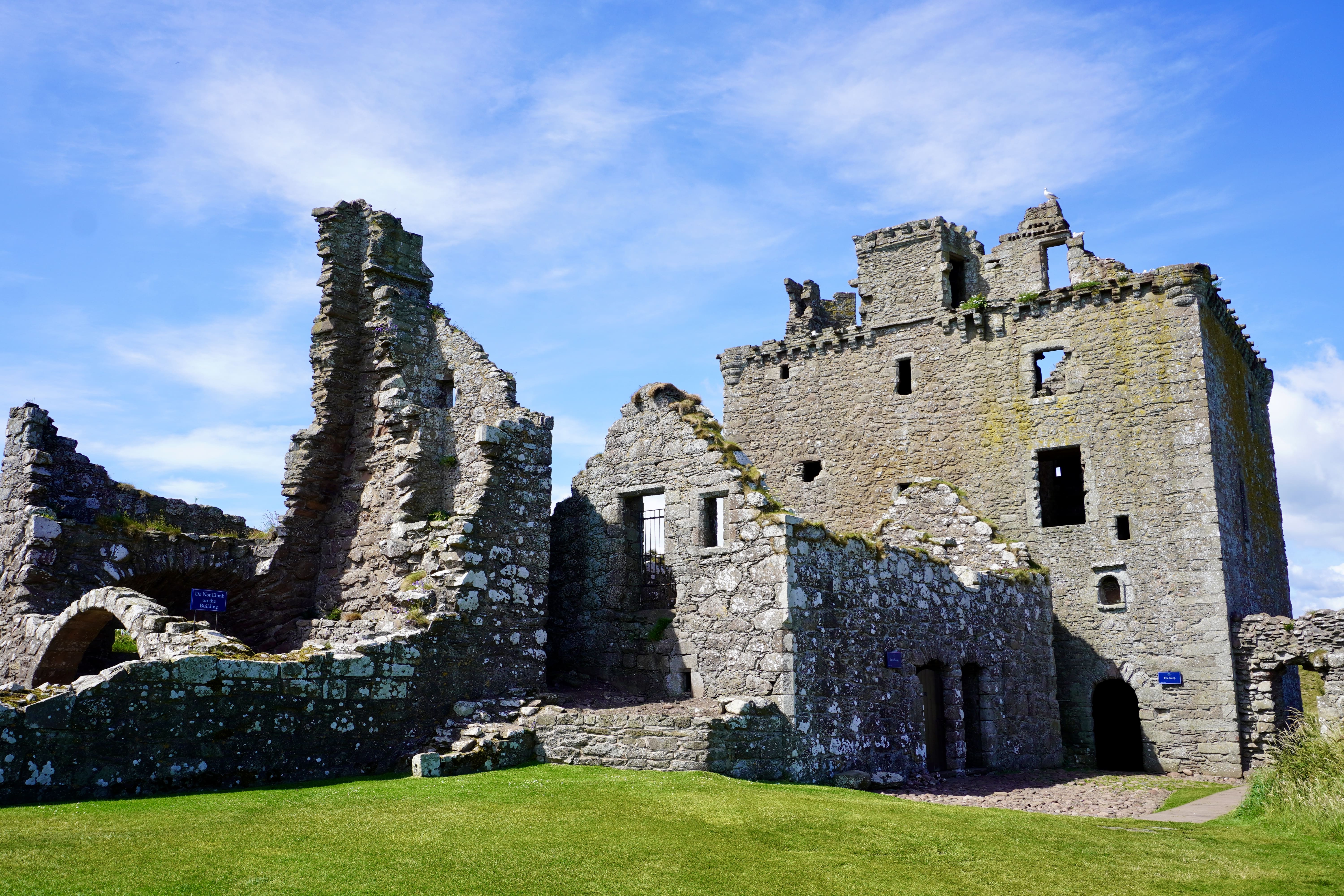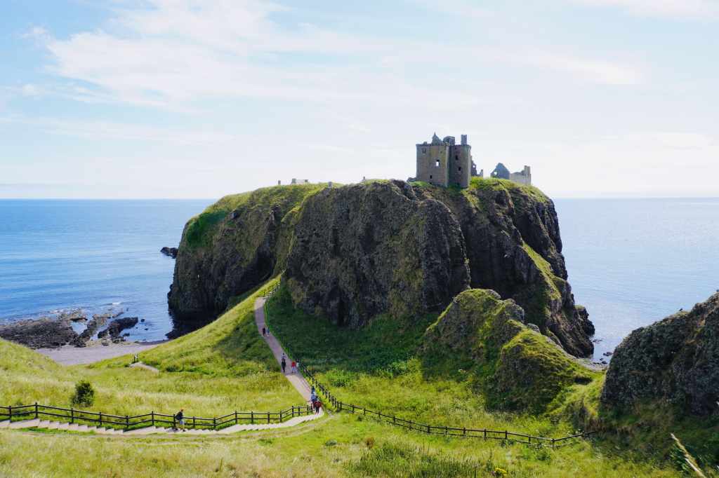 Le château de Dunnottar est situé sur la côte est de l’Écosse, dans la région de l’Aberdeenshire. Il est construit sur un promontoire rocheux qui surplombe la mer du Nord. Ce qui frappe tout de suite, c’est son isolement : entouré de falaises abruptes et accessible uniquement par un sentier escarpé, le site semble tout droit sorti d’un roman médiéval. L’endroit est sauvage, spectaculaire et offre une vue imprenable sur l’océan.