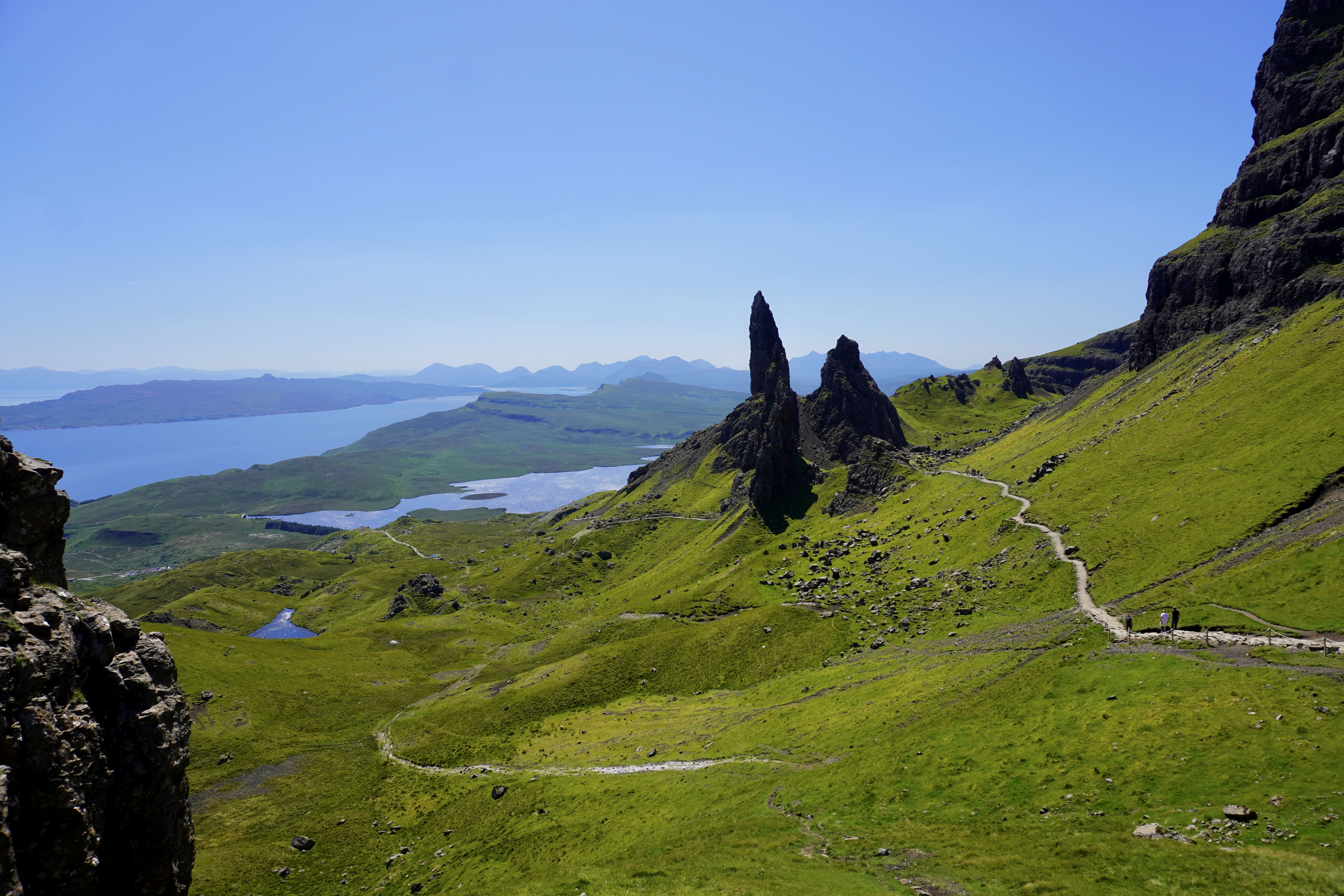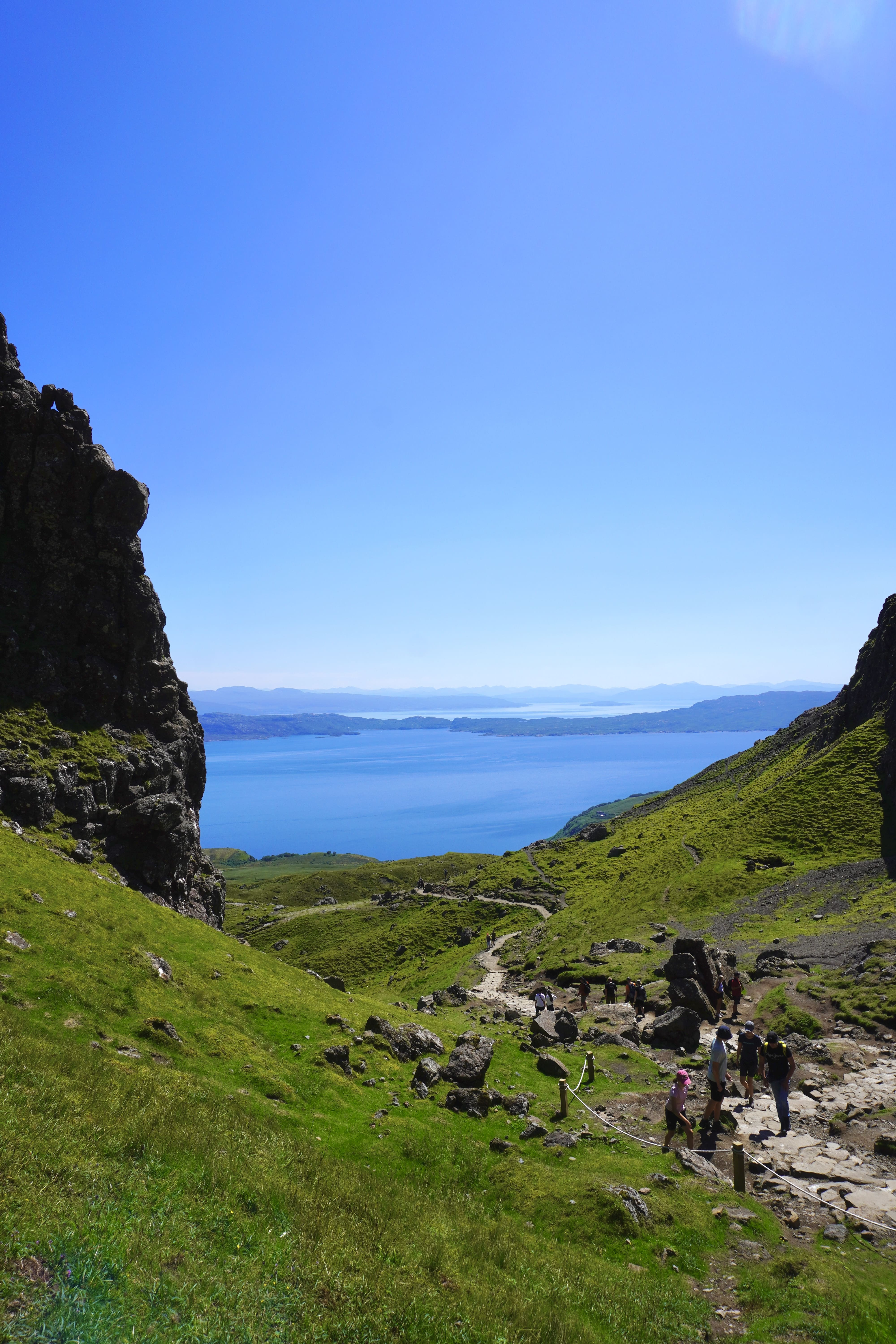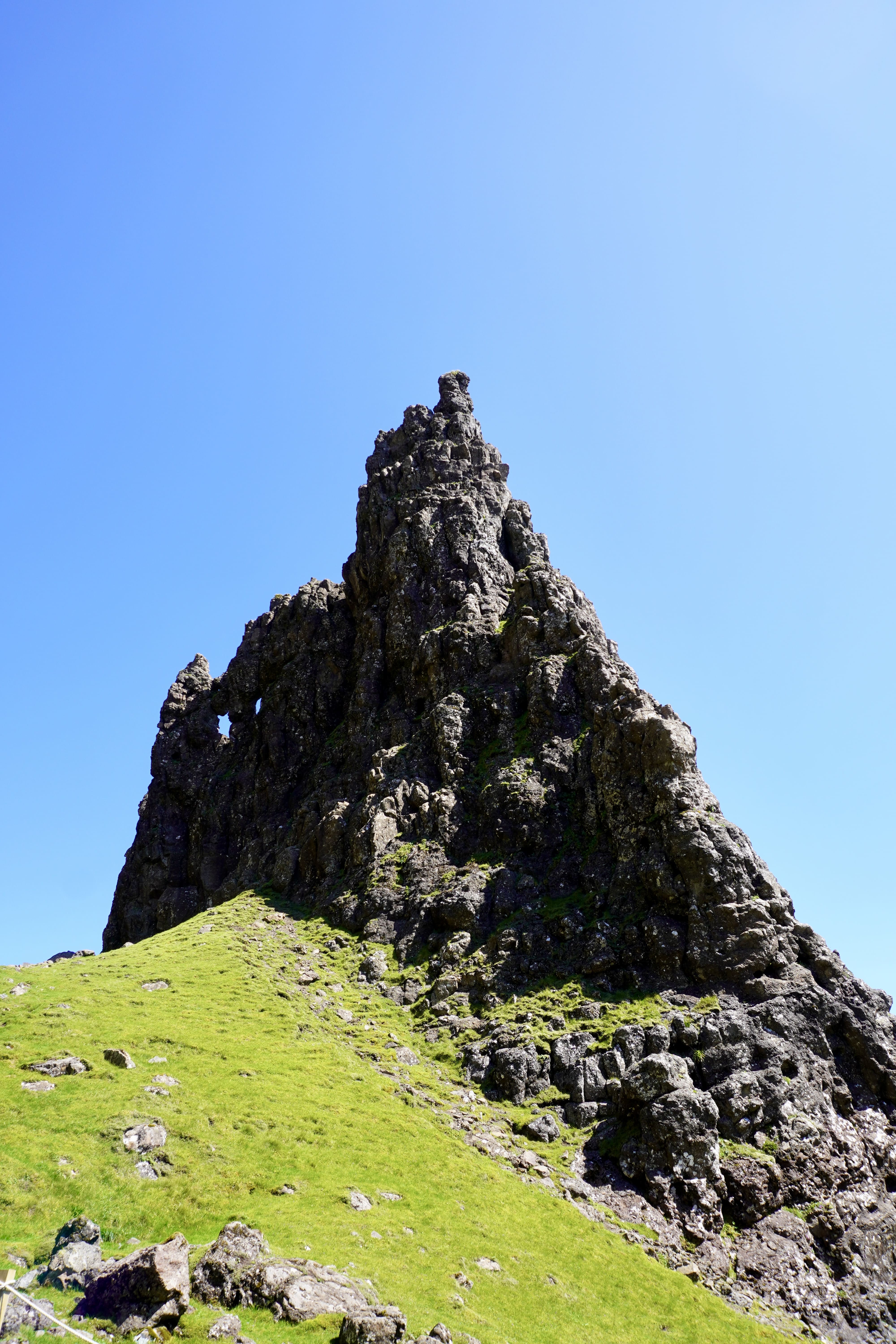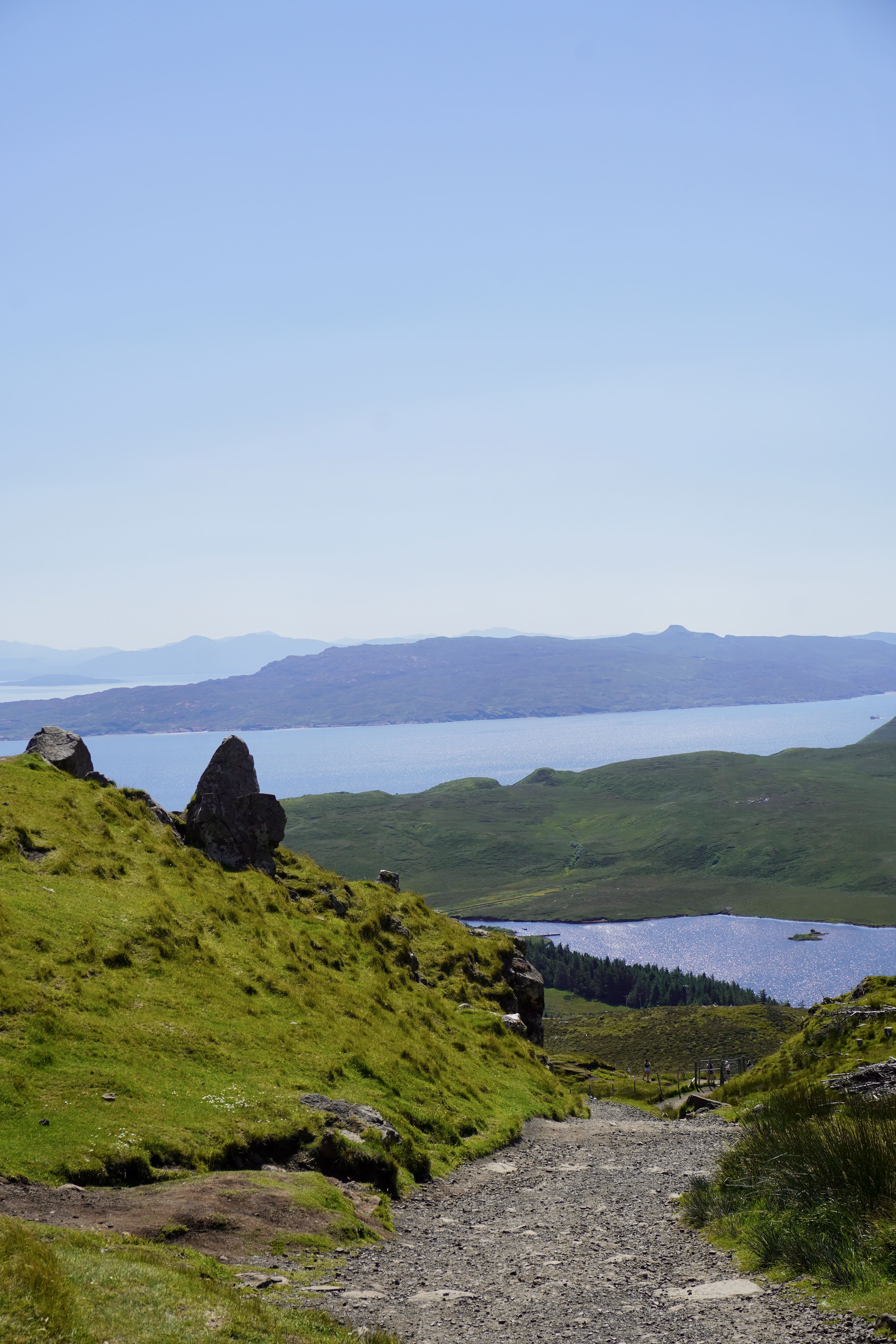 Le sentier grimpe assez raide jusqu’à une impressionnante aiguille de basalte de 50 mètres. Une fois en haut, la vue sur les lochs et les collines est spectaculaire.