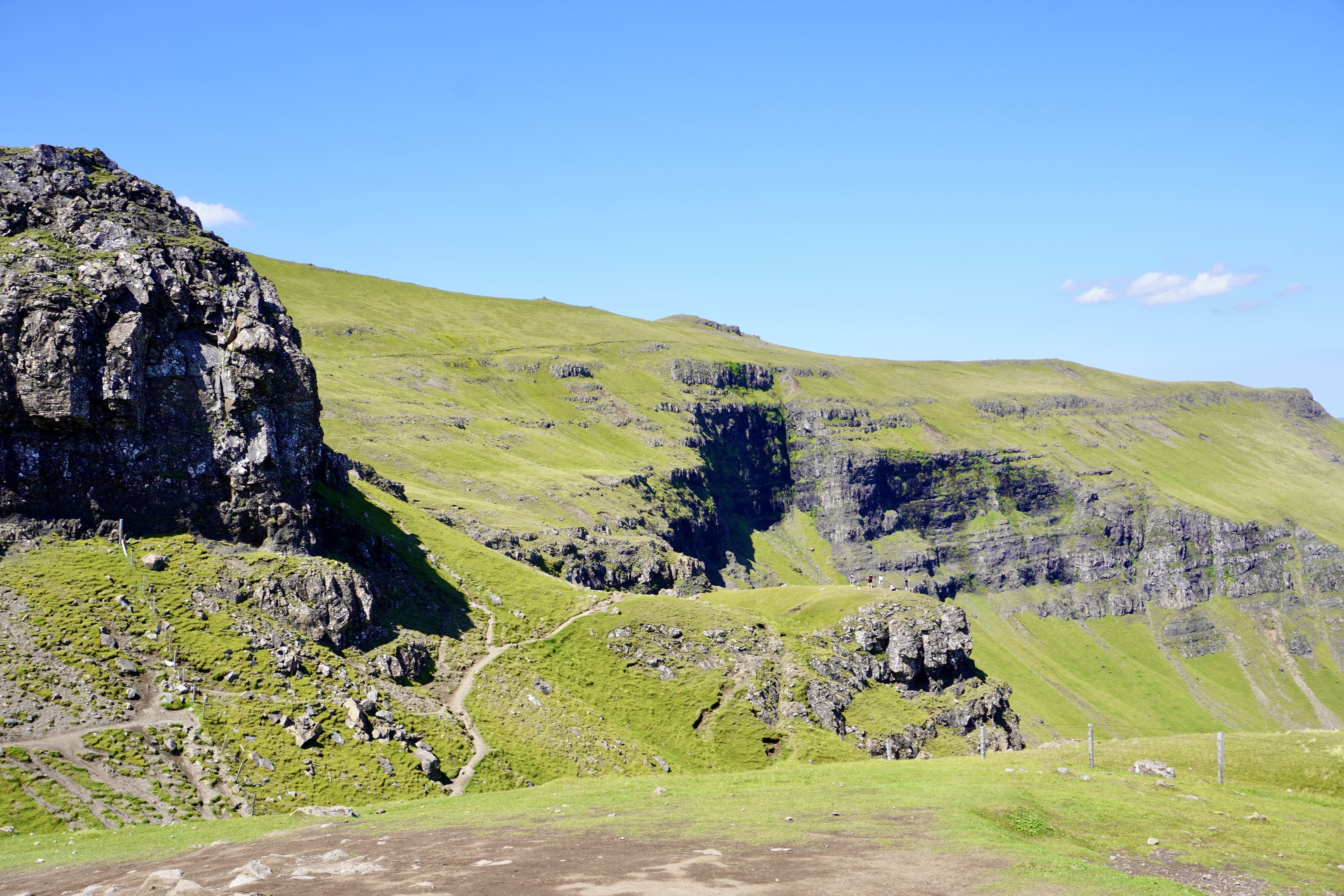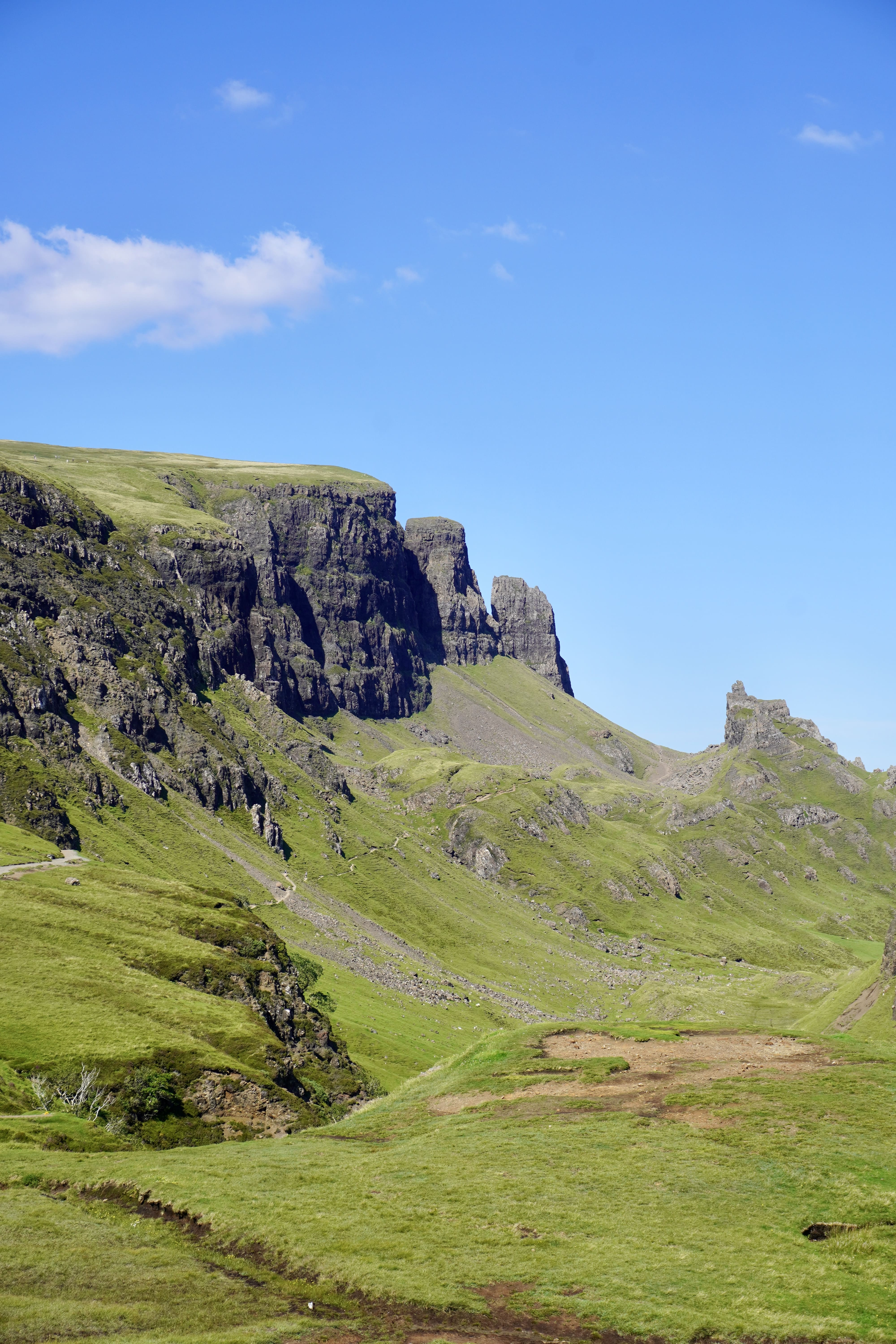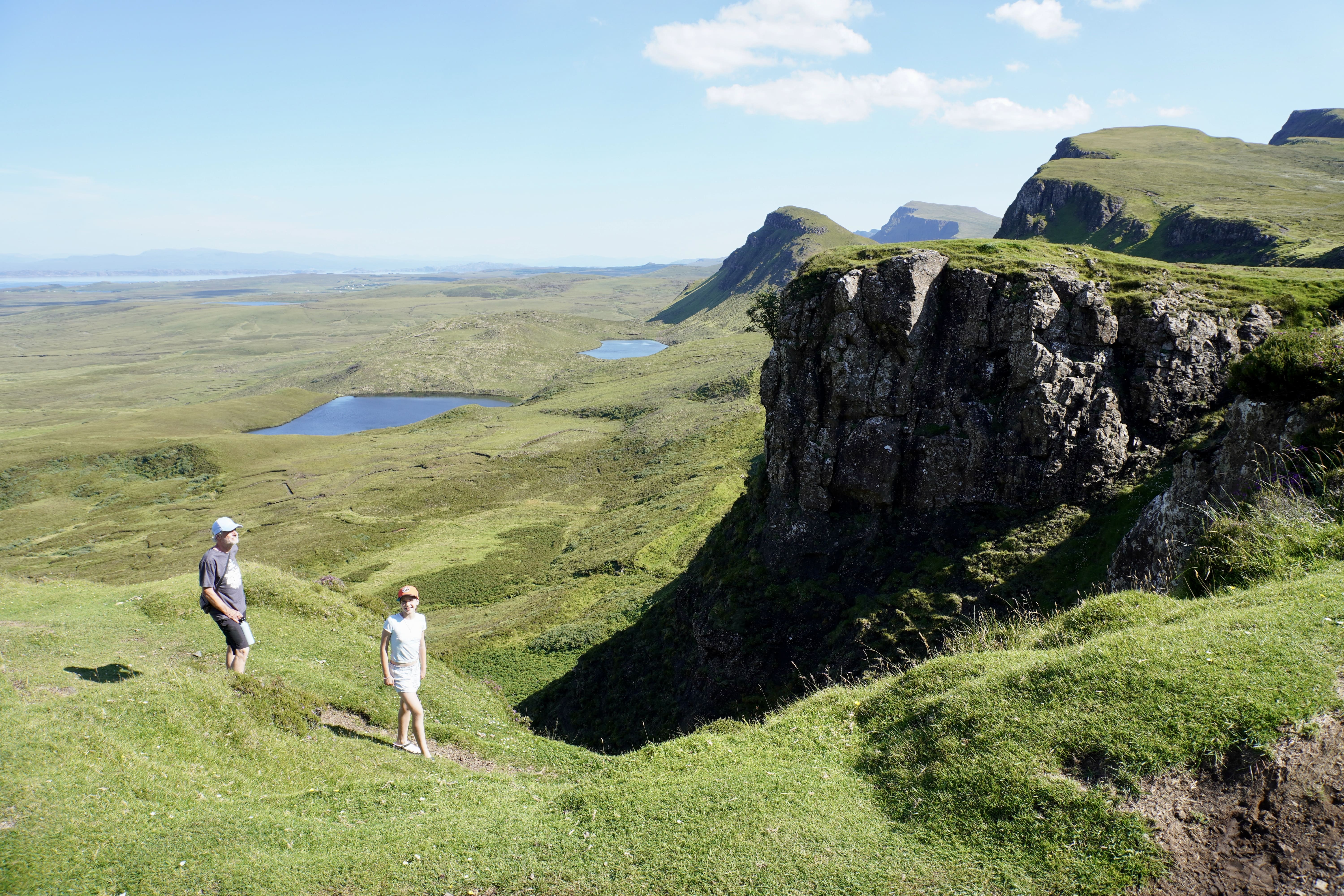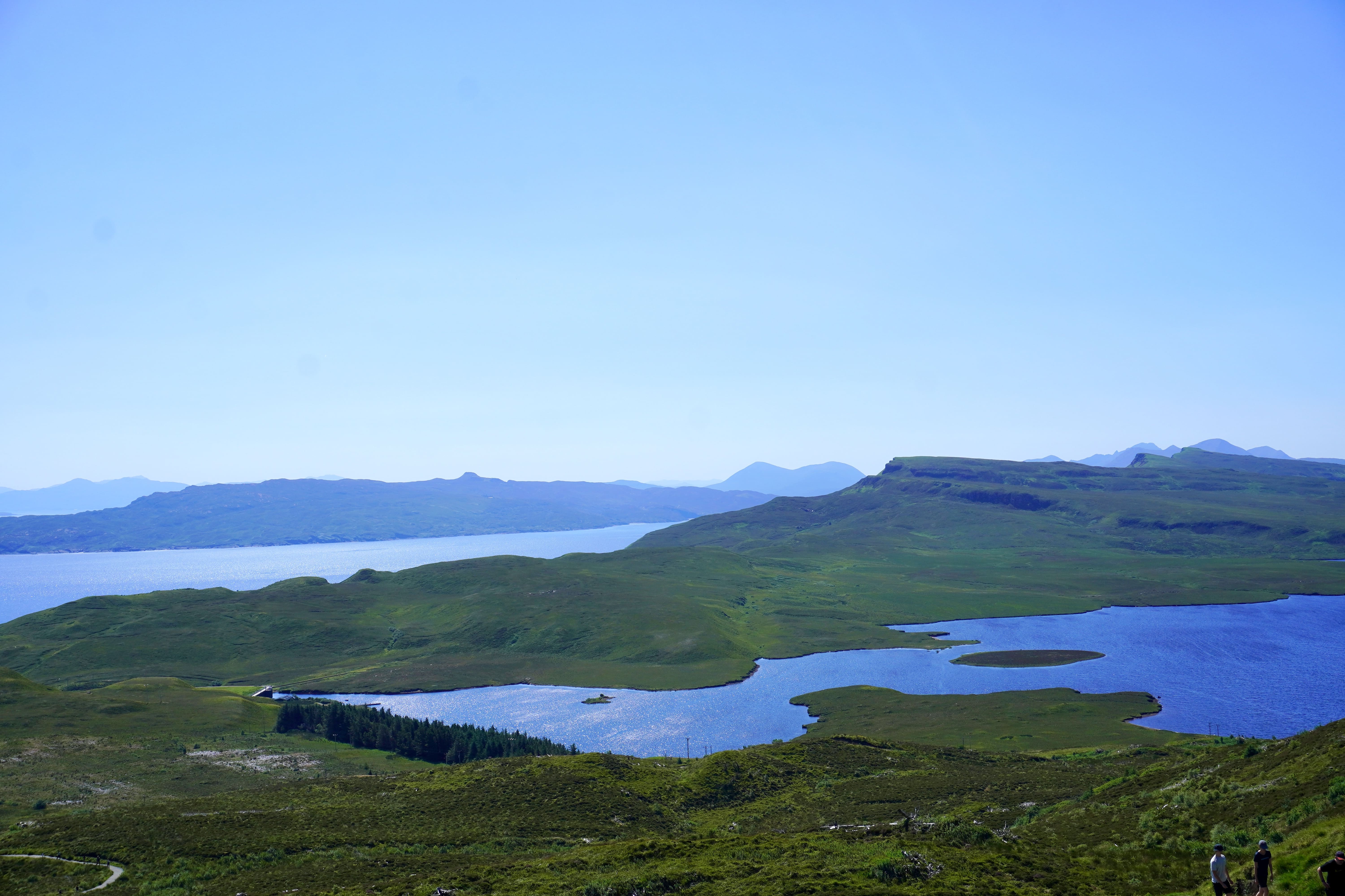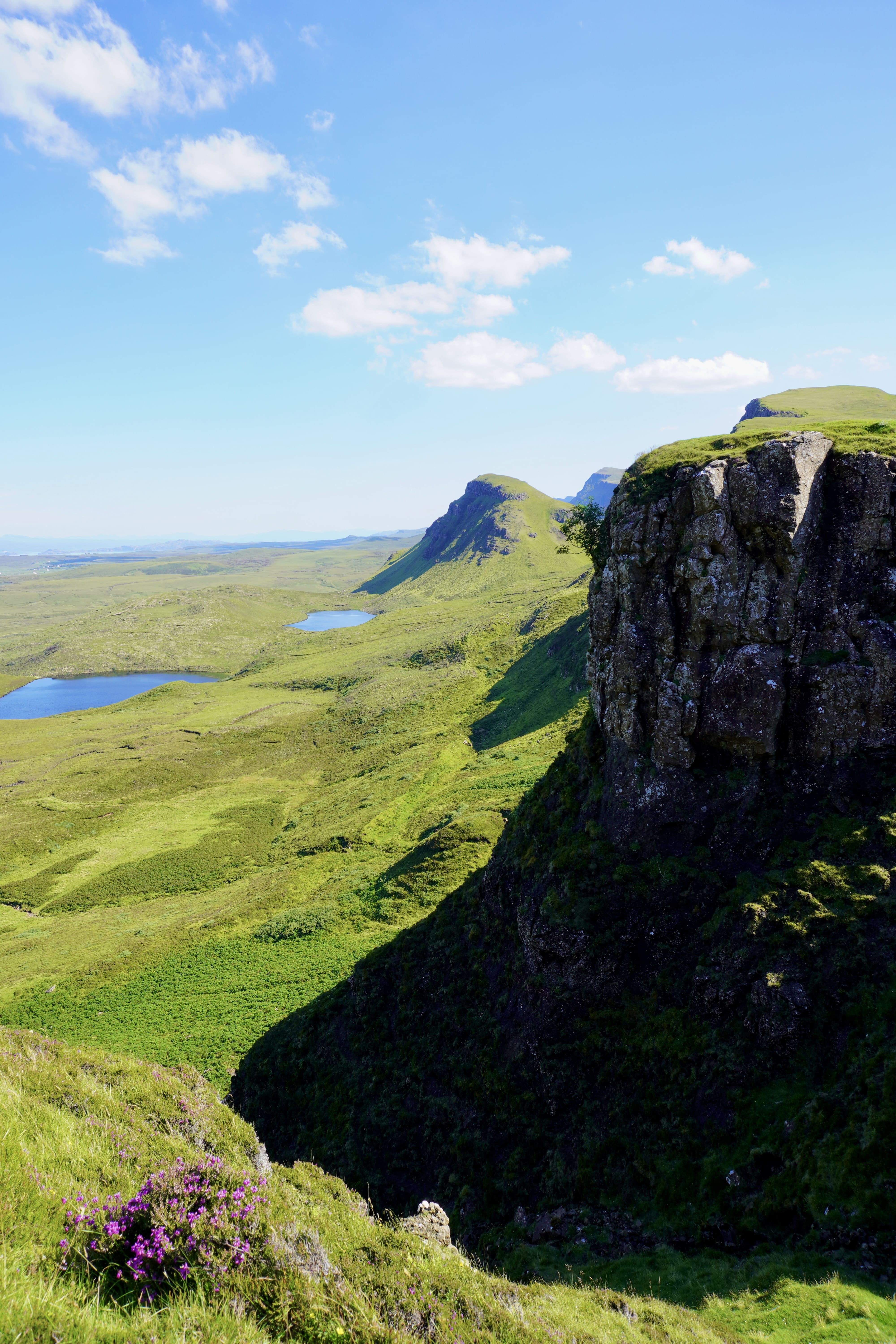 Le sentier grimpe assez raide jusqu’à une impressionnante aiguille de basalte de 50 mètres. Une fois en haut, la vue sur les lochs et les collines est spectaculaire.